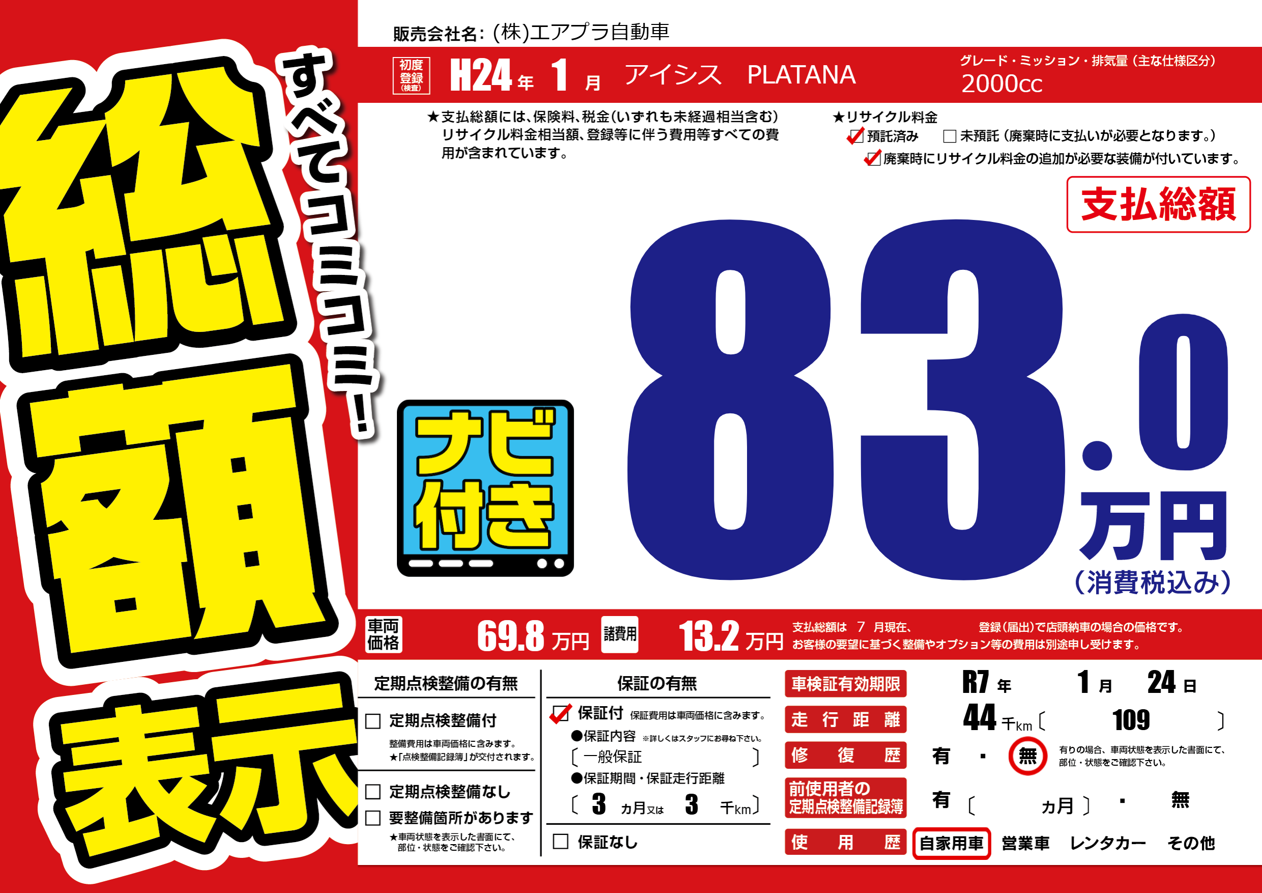 | 車名 | アイシス PLATANA | グレード ミッション 排気量 |