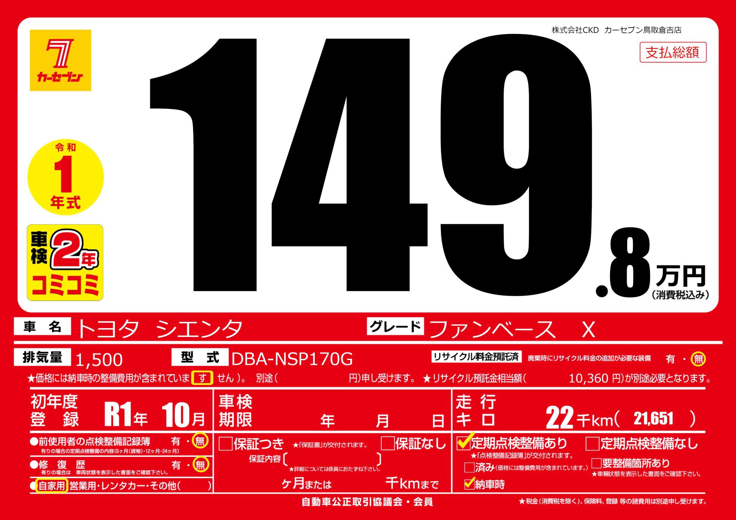 | 車名 | トヨタ シエンタ | グレード ミッション 排気量 |