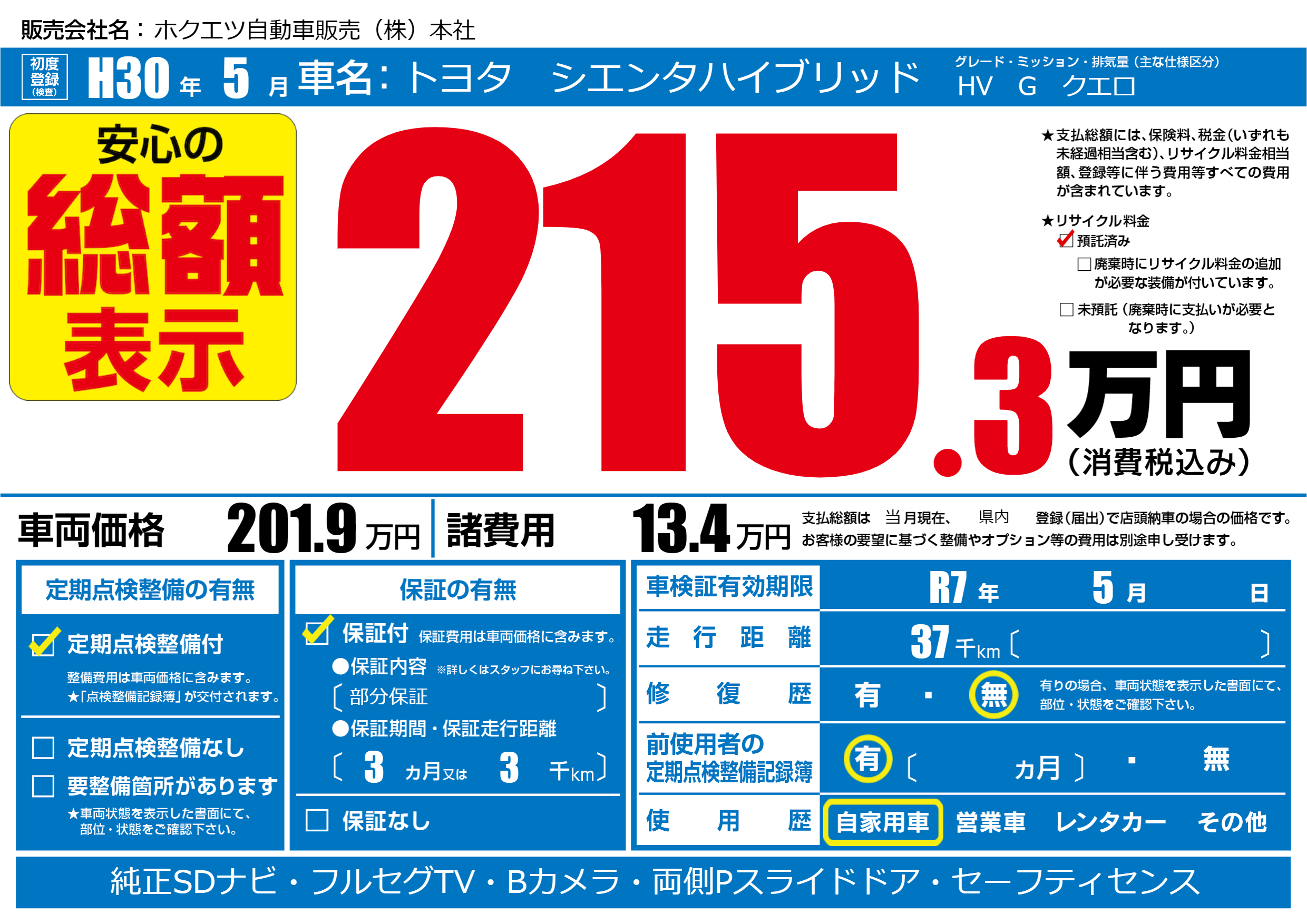 | 車名 | トヨタ シエンタハイブリッド | グレード ミッション 排気量 |