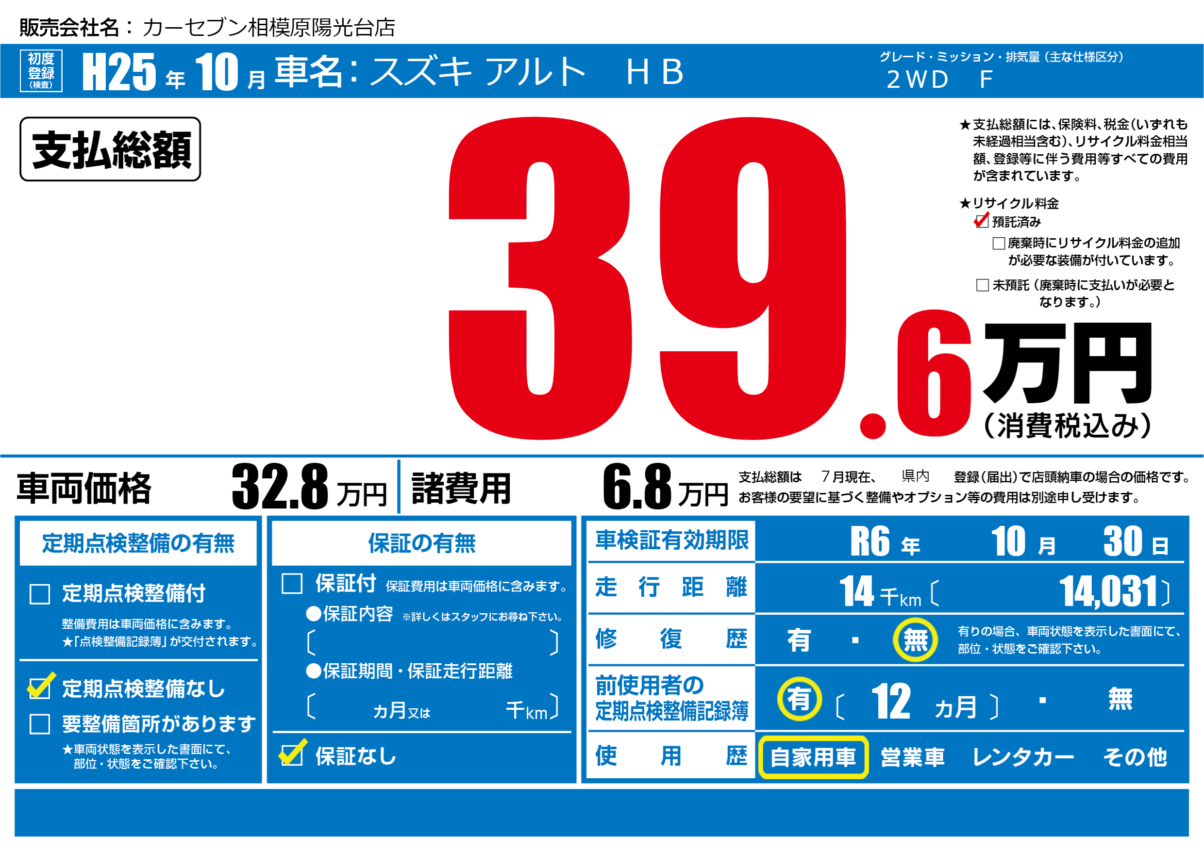 | 走行キロ | 1.4万km | 初年度登録 | H25年10月 |