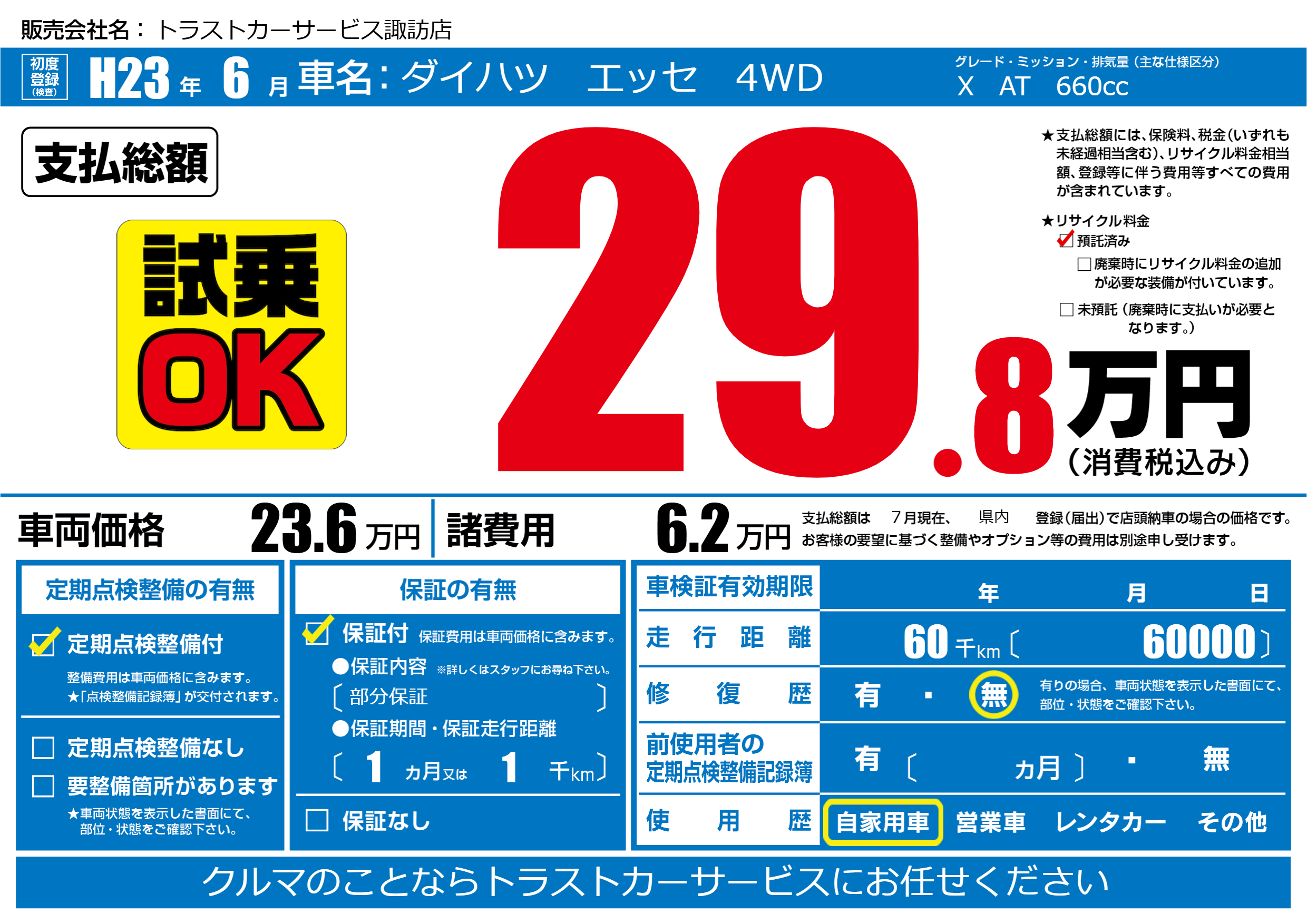 | 車名 | ダイハツ エッセ 4WD | グレード ミッション 排気量 |