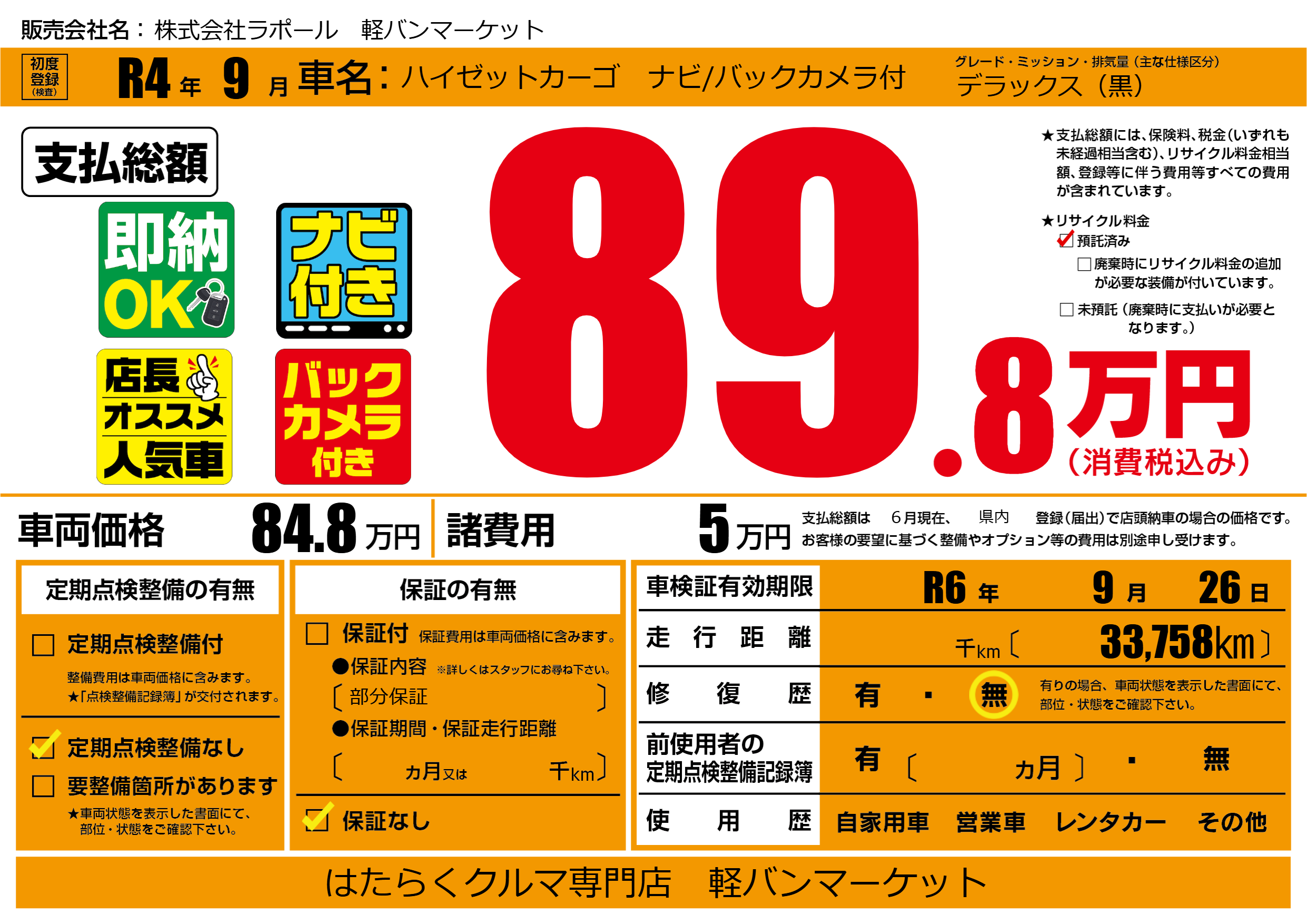 なし | 車検制限 | R6年9月26月 |
