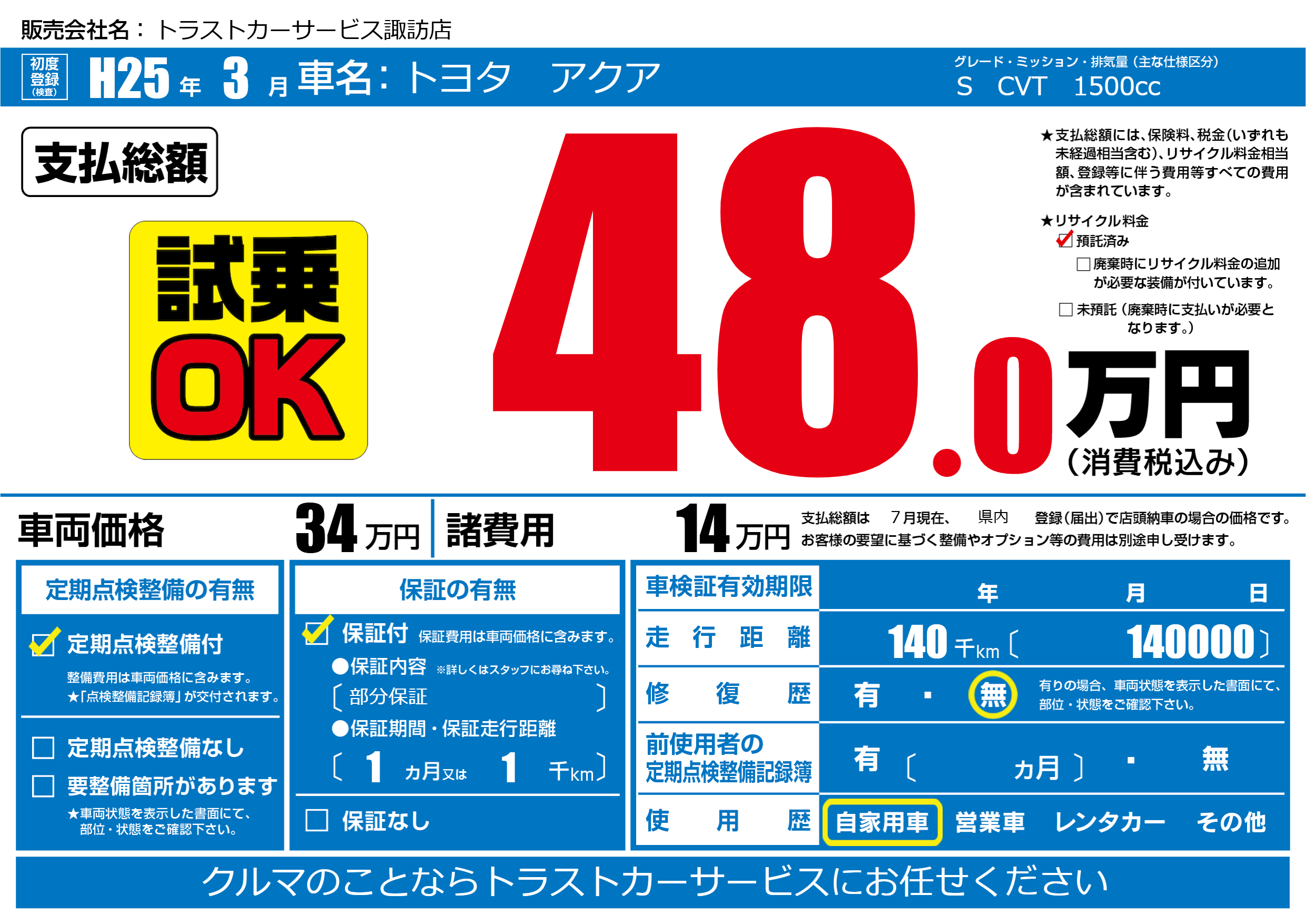 | 車名 | トヨタ アクア | グレード ミッション 排気量 |