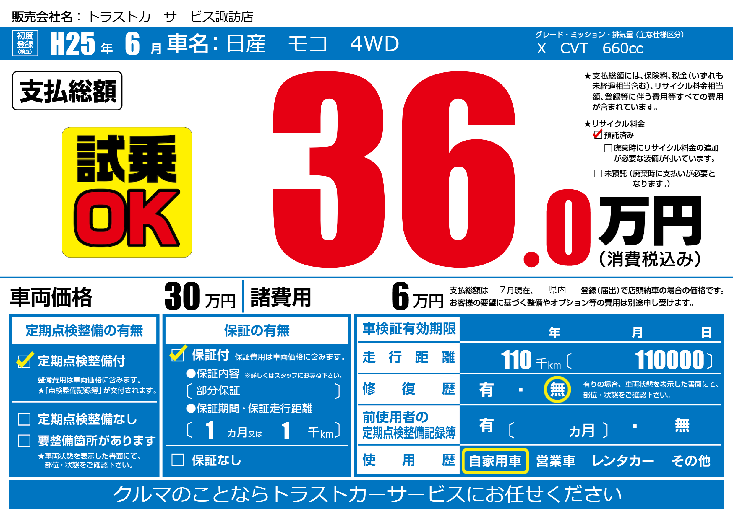 | 車名 | 日産 モコ 4WD | グレード ミッション 排気量 |