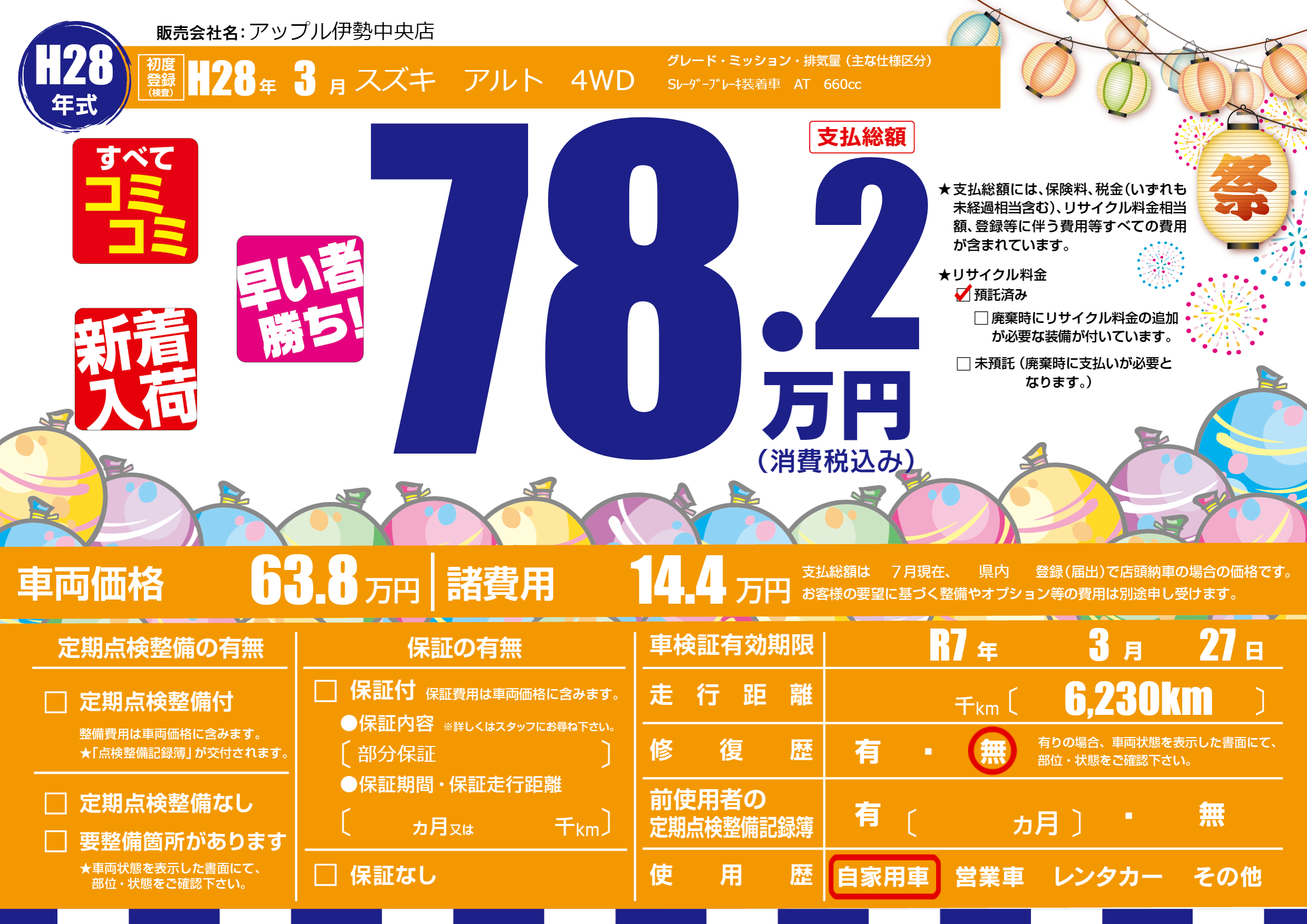 | 車名 | スズキ アルト 4WD | グレード ミッション 排気量 |