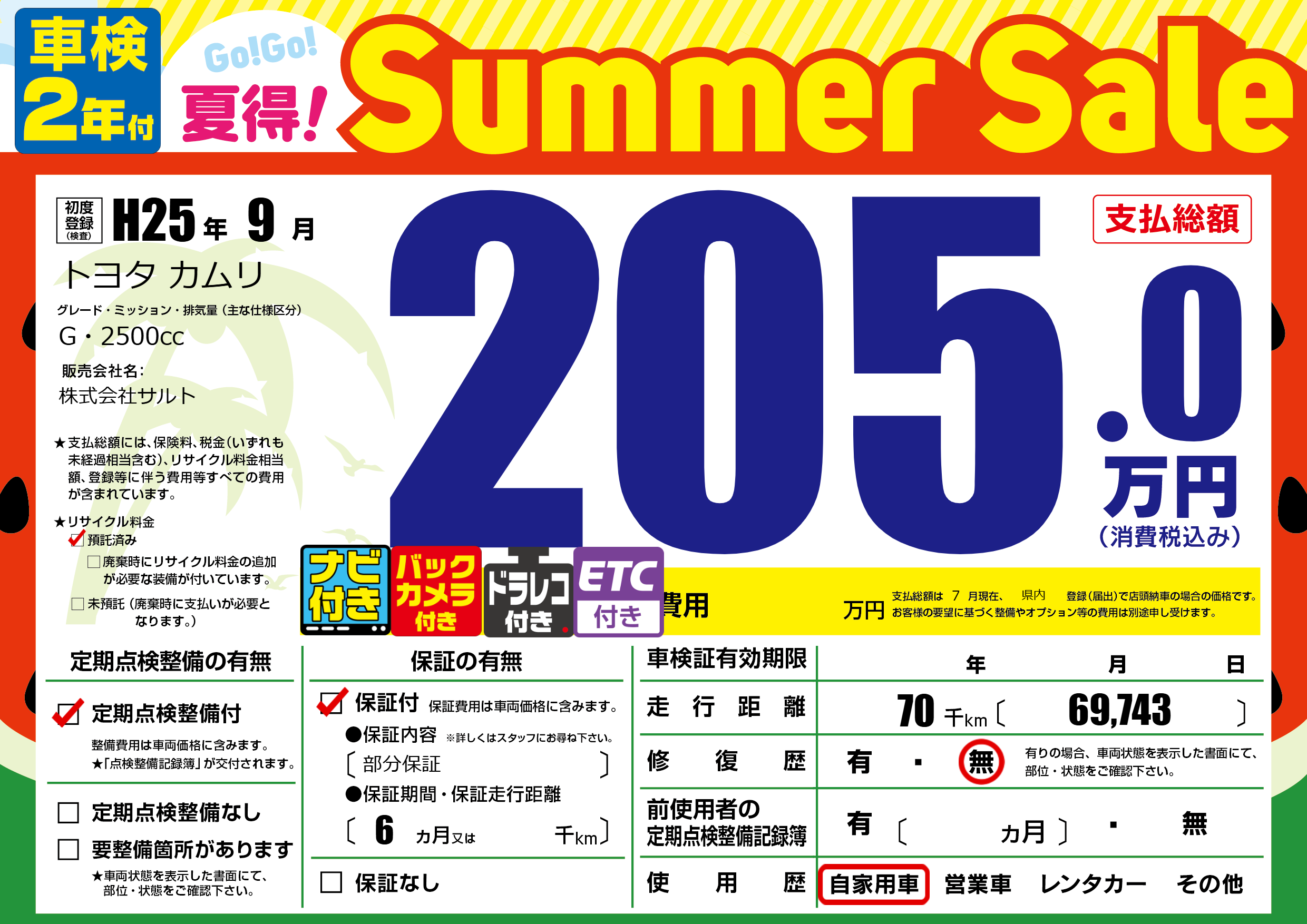 | 走行キロ | 7万km | 初年度登録 | H25年9月 |