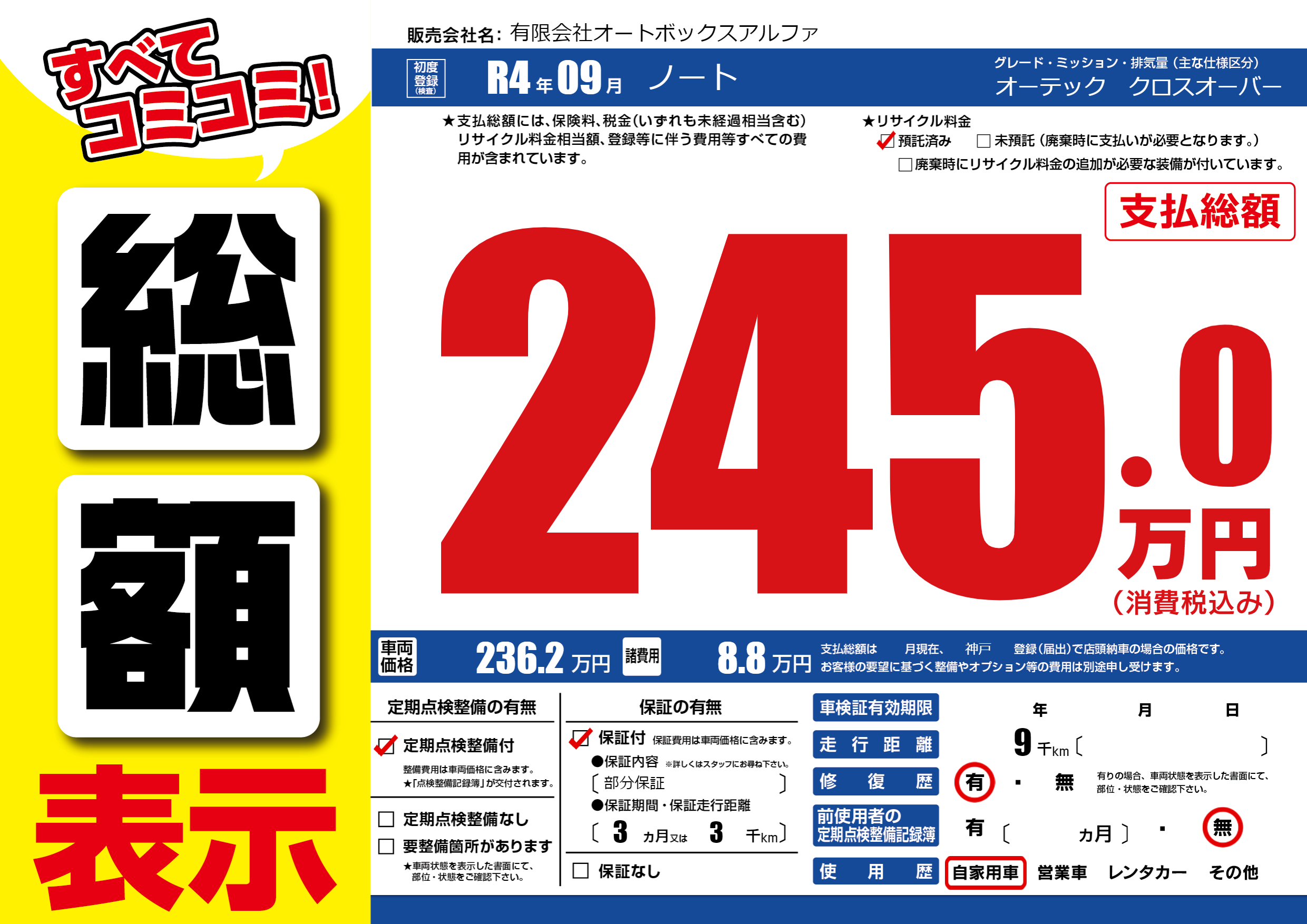 | 走行キロ | 0.9万km | 初年度登録 | R4年09月 |