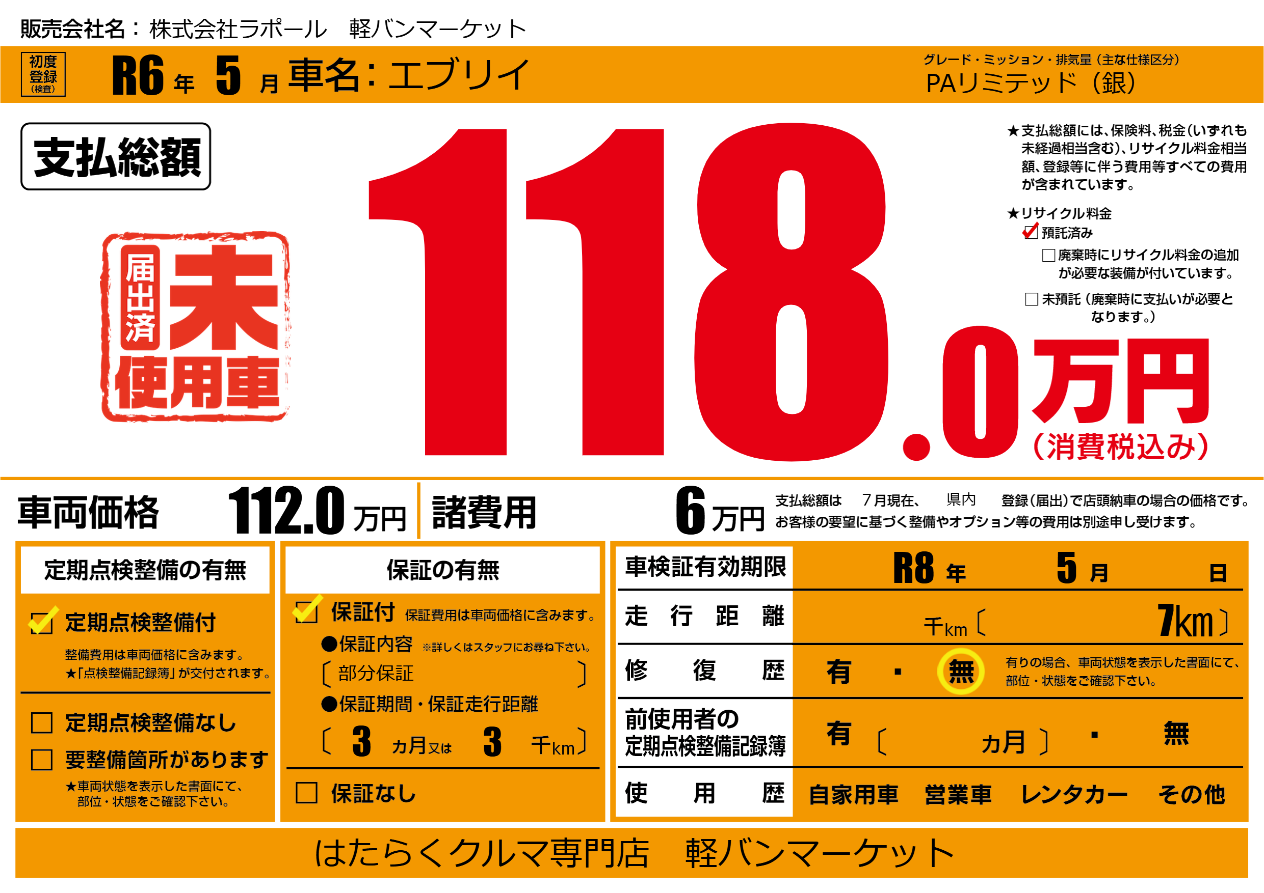 なし | 車検制限 | R8年5月---月 |