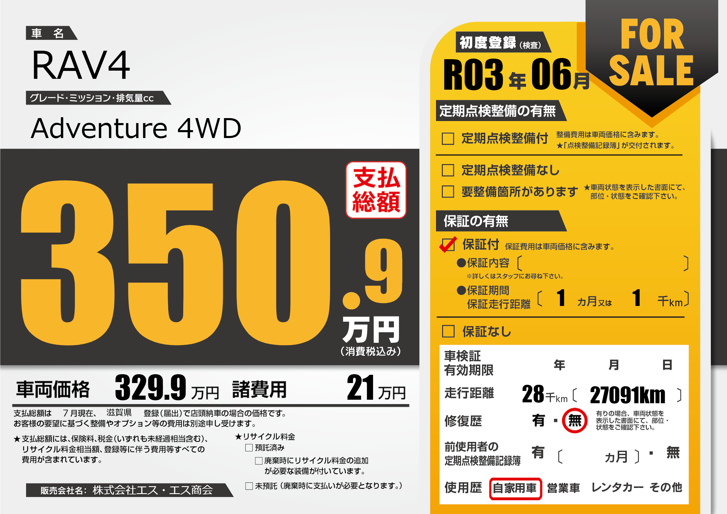 | 走行キロ | 2.8万km | 初年度登録 | R03年06月 |