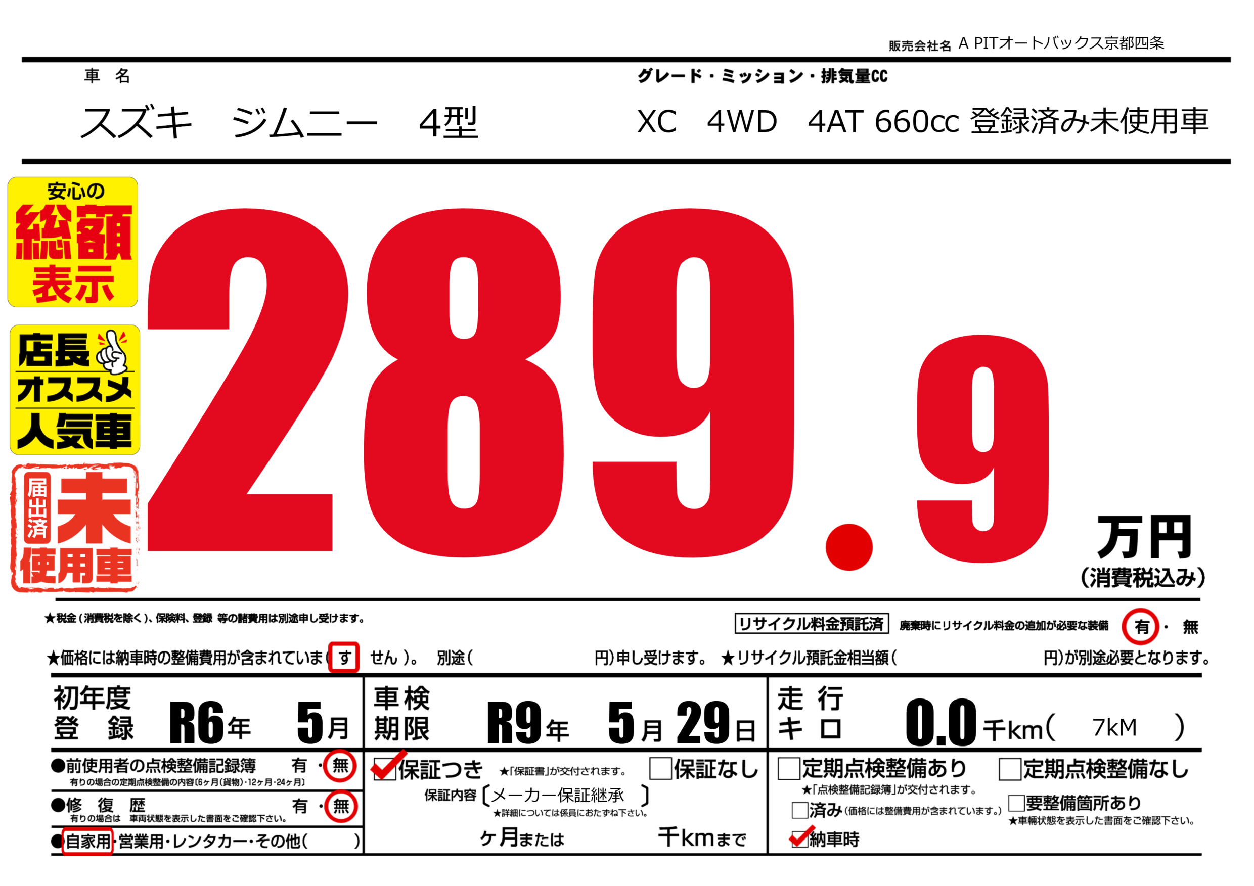 | 車名 | スズキ ジムニー 4型 | グレード ミッション 排気量 |