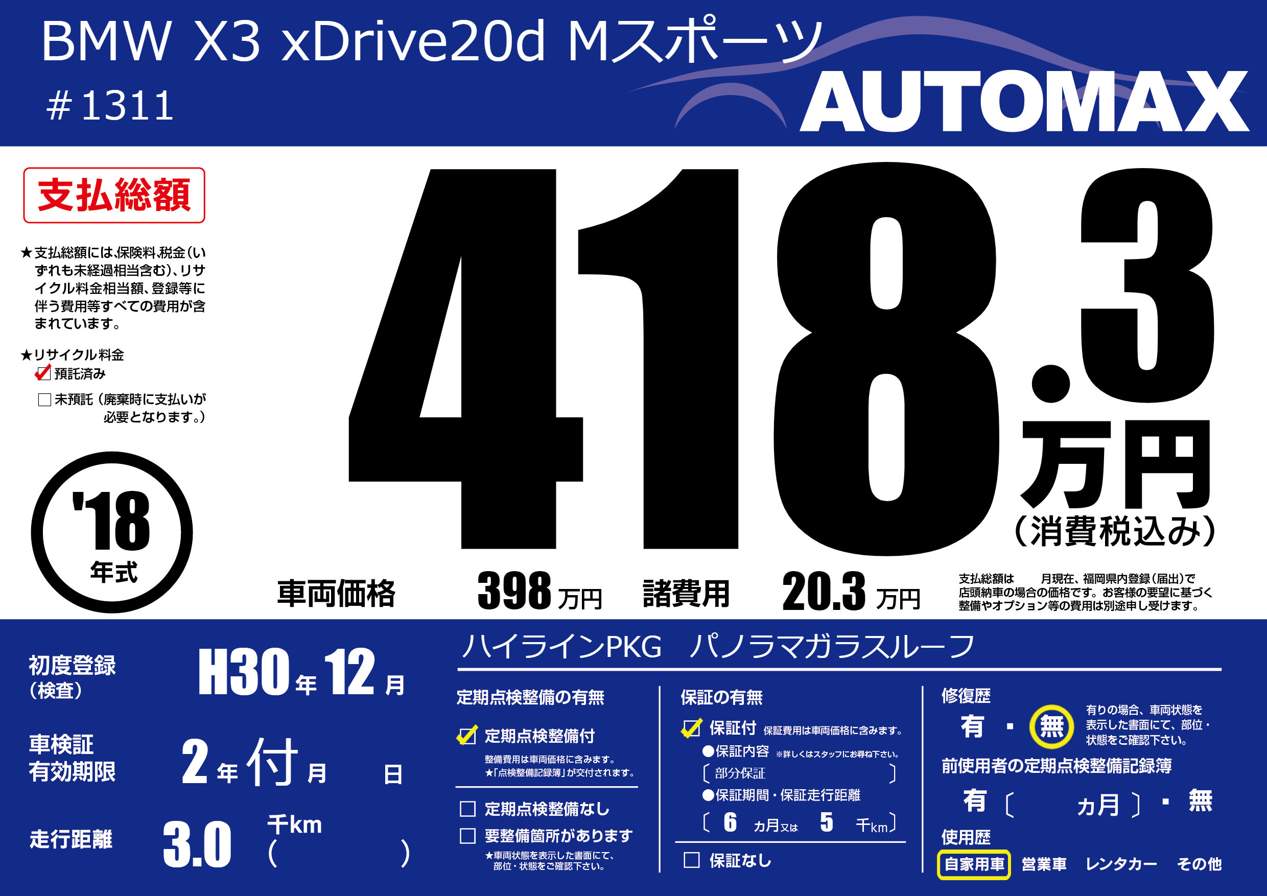 | 車名 | BMW X3 xDrive20d Mスポーツ | グレード ミッション 排気量 |