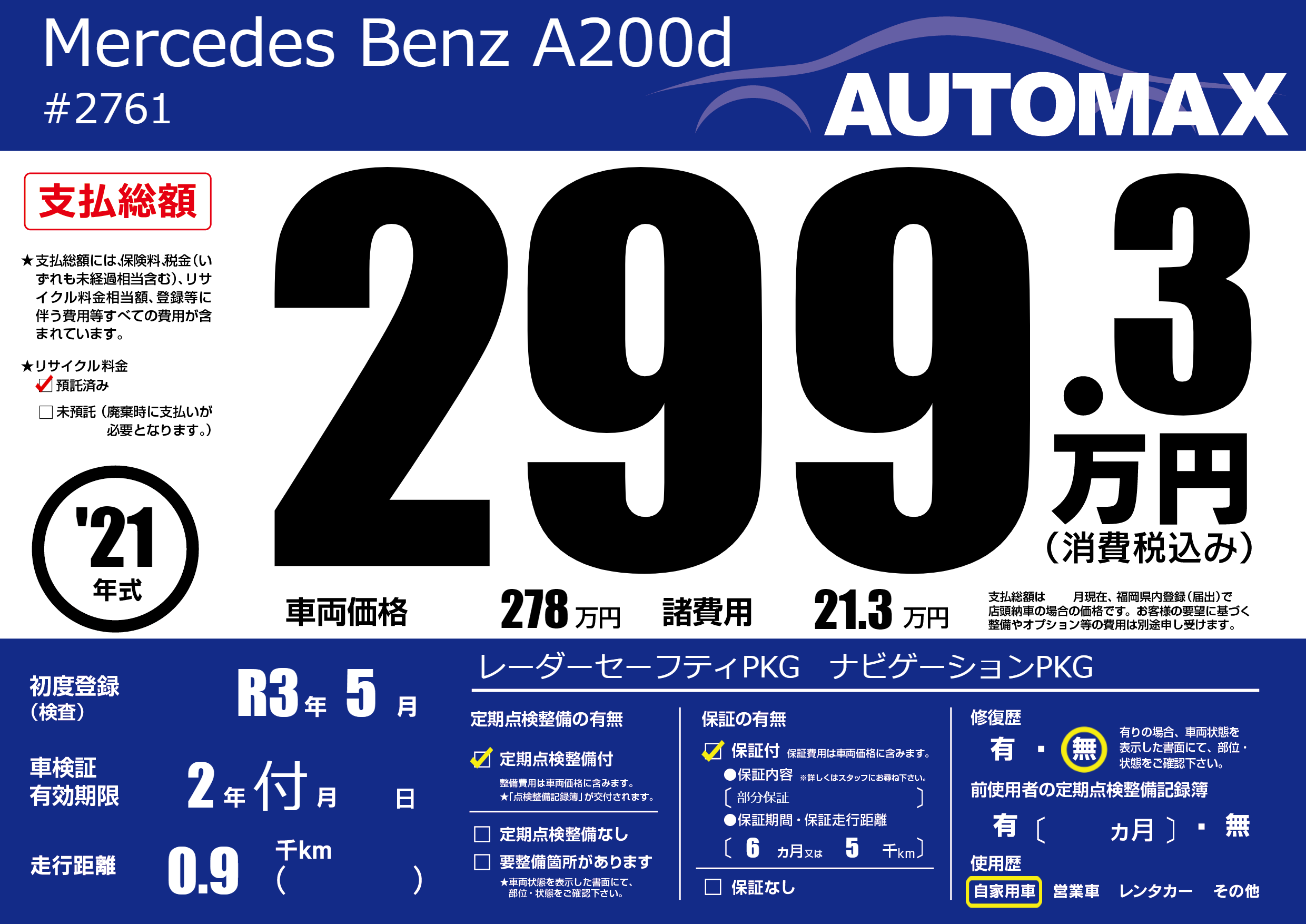 | 車名 | Mercedes Benz A200d | グレード ミッション 排気量 |