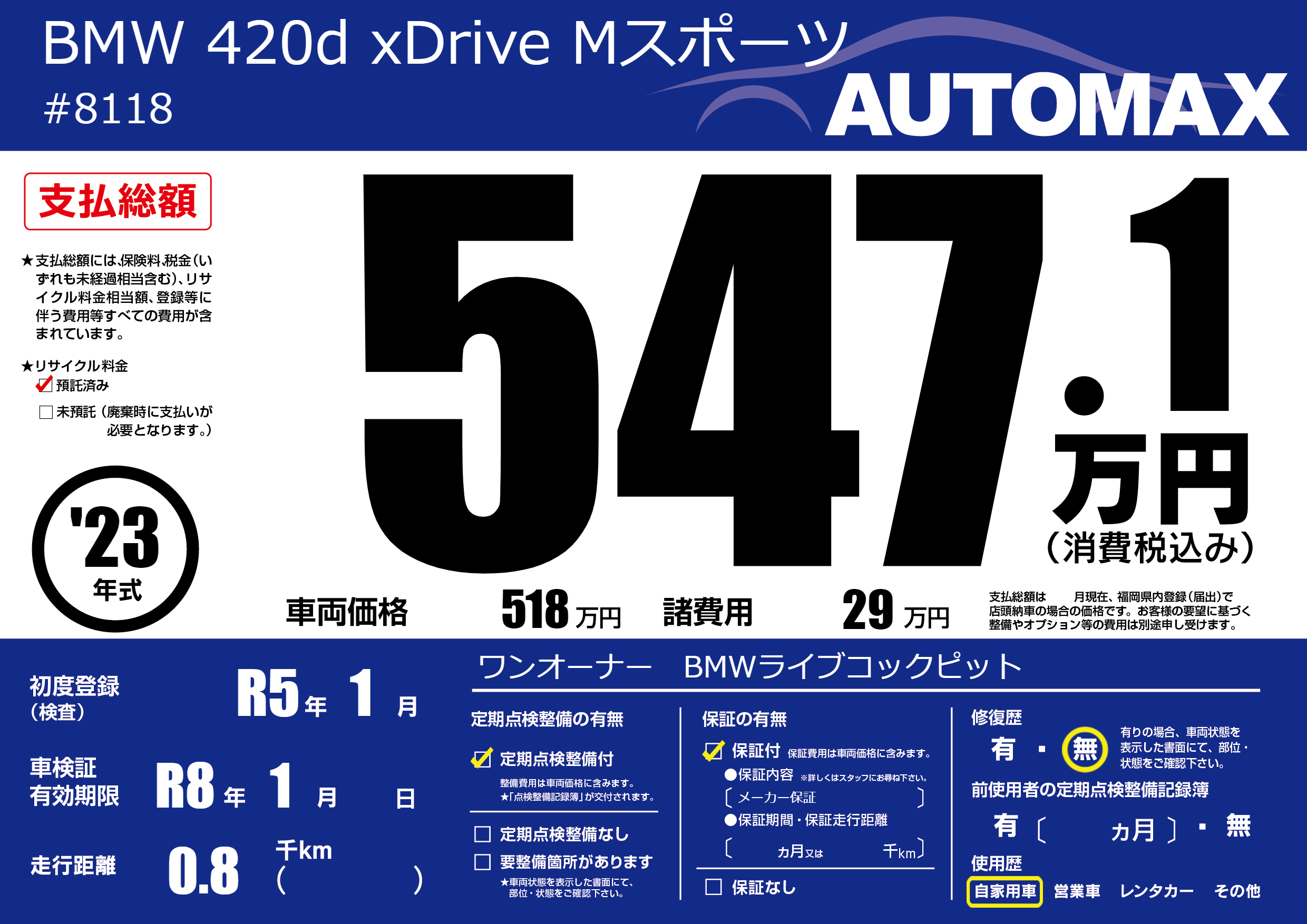 | 車名 | BMW 420d xDrive Mスポーツ | グレード ミッション 排気量 |