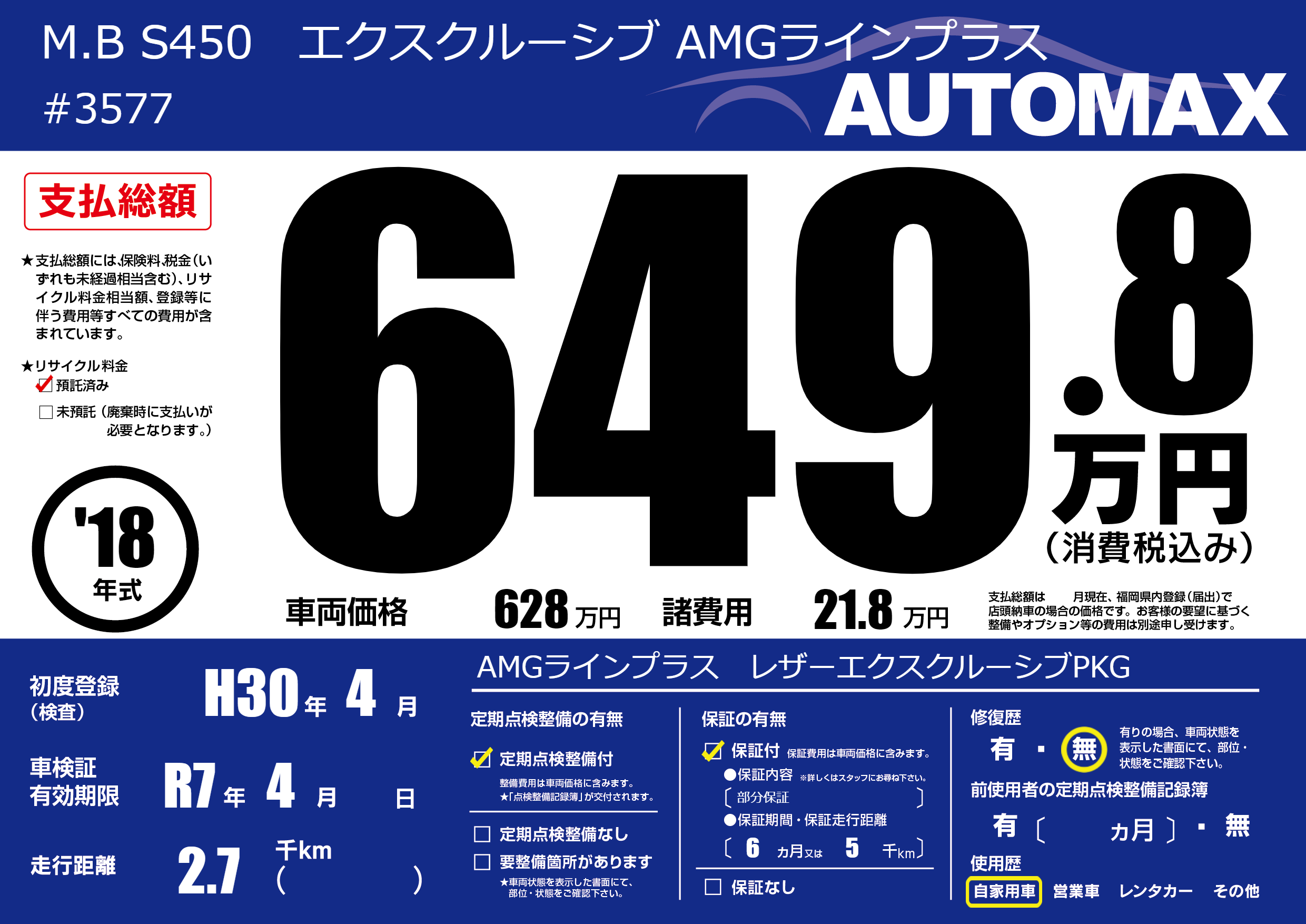 | 車名 | M.B S450 エクスクルーシブ AMGラインプラス | グレード ミッション 排気量 |