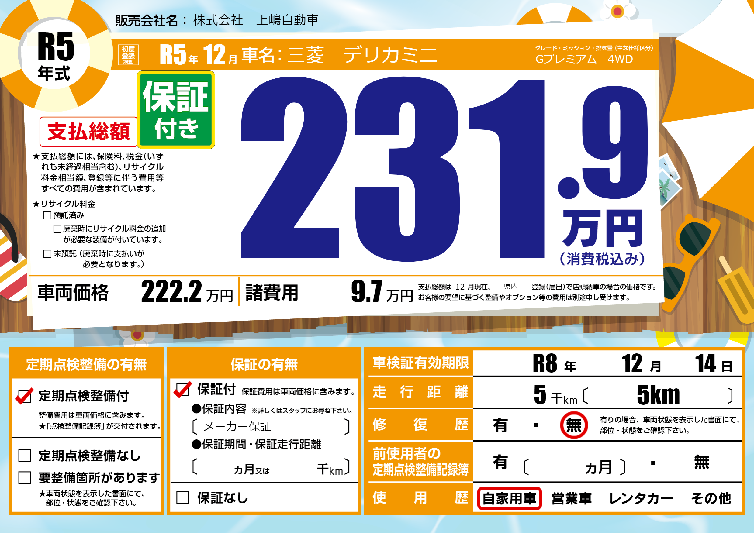 | 走行キロ | 0.5万km | 初年度登録 | R5年12月 |