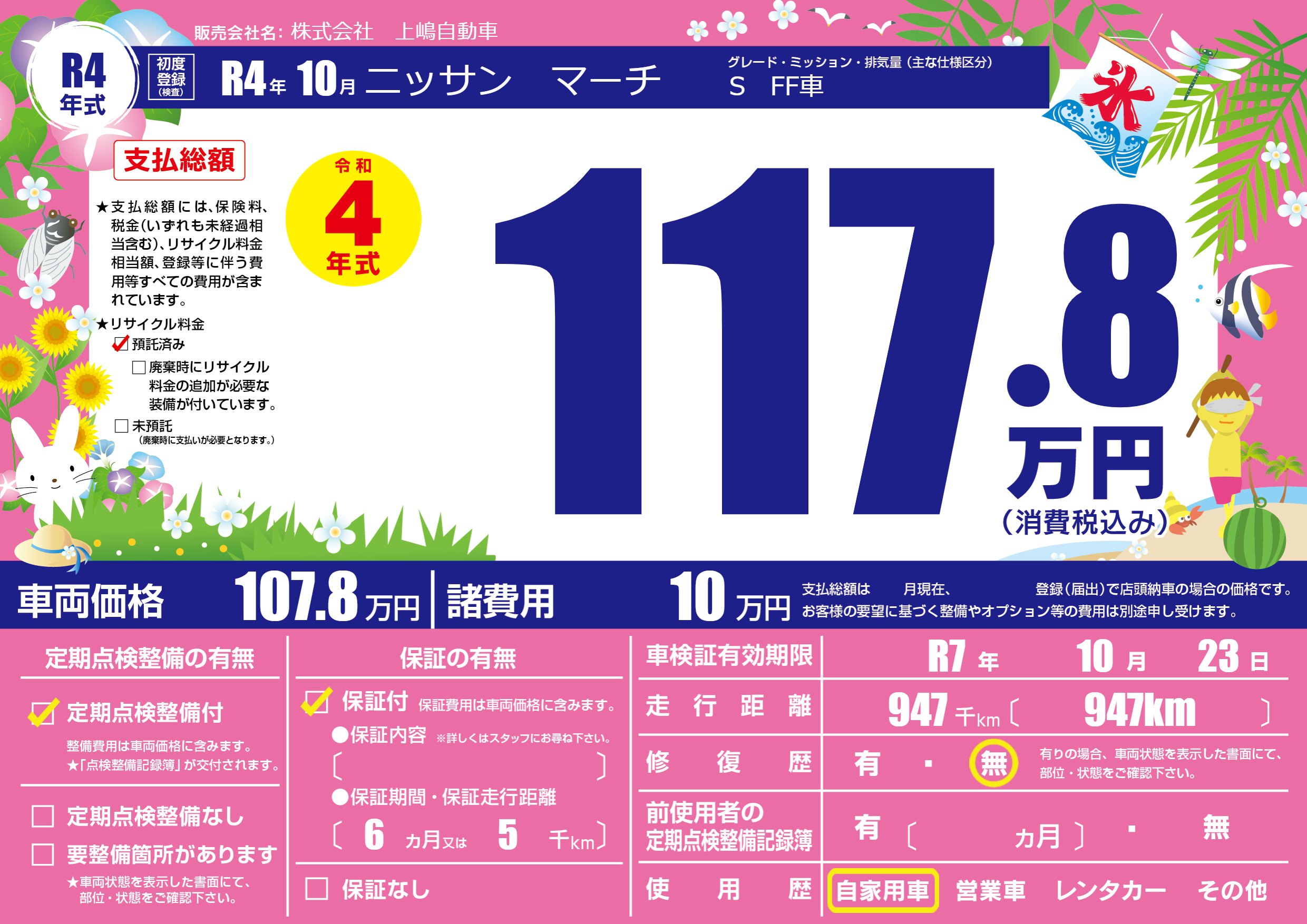| 車名 | ニッサン マーチ | グレード ミッション 排気量 |