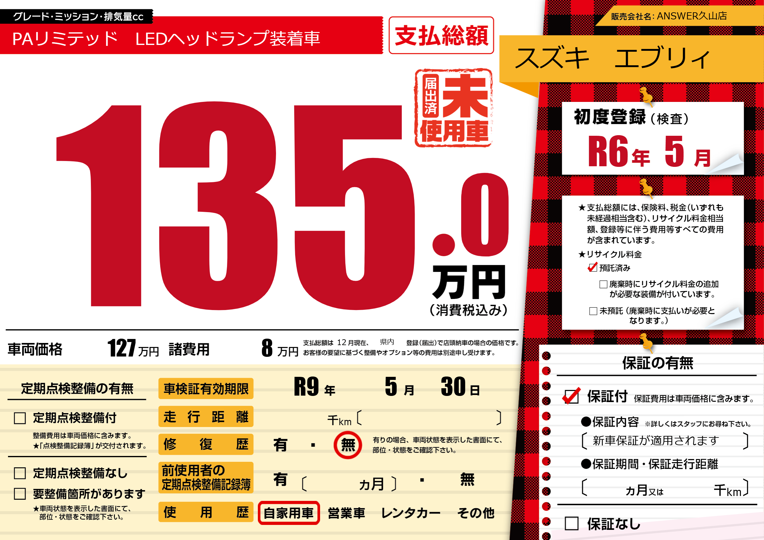 保証付き 保証内容(新車保証が適用されます) ---ヶ月または()千kmまで |
