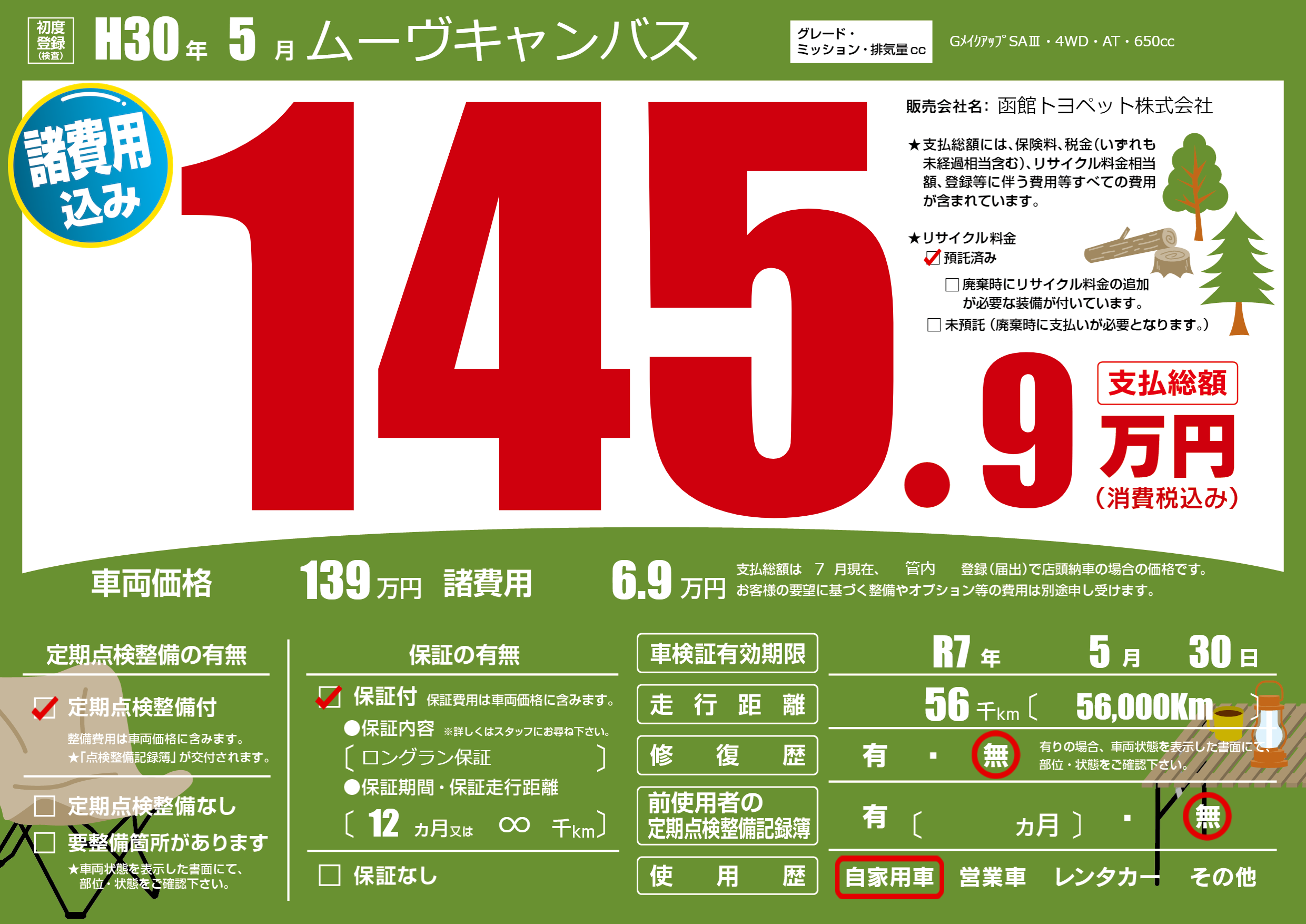 | 走行キロ | 5.6万km | 初年度登録 | H30年5月 |