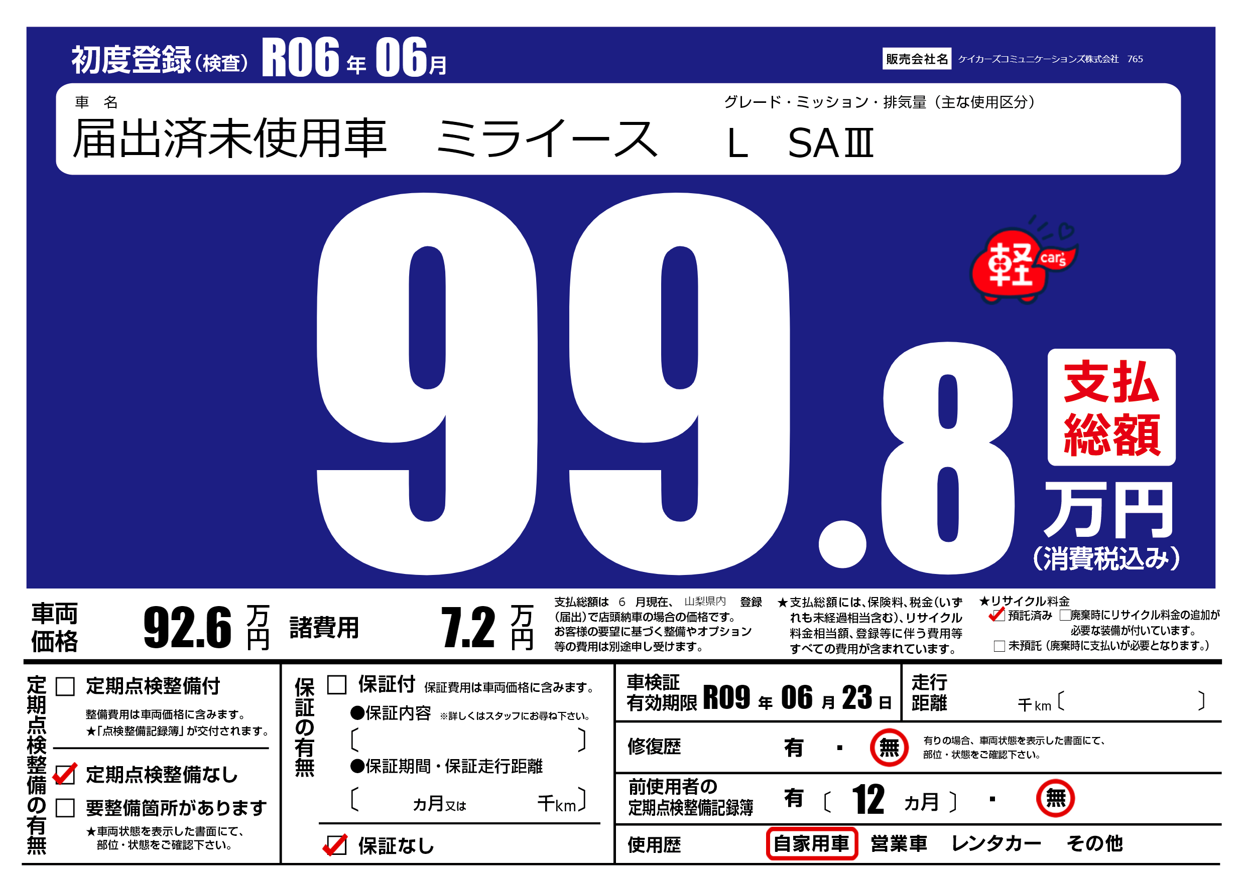 | 車名 | 届出済未使用車 ミライース | グレード ミッション 排気量 |
