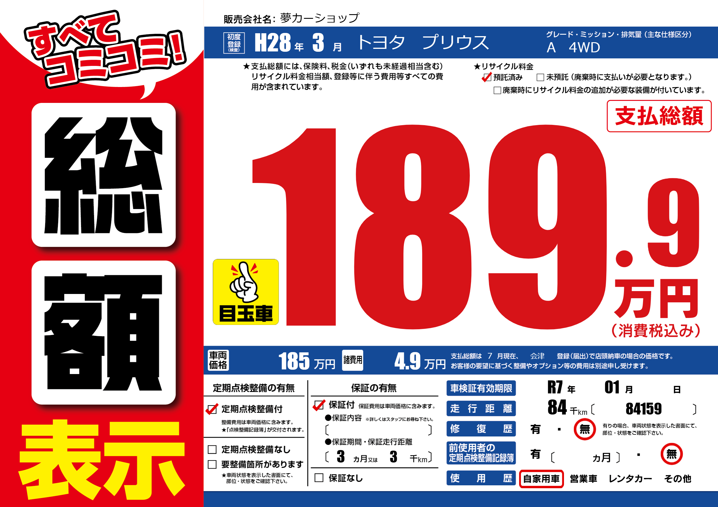 | 車名 | トヨタ プリウス | グレード ミッション 排気量 |