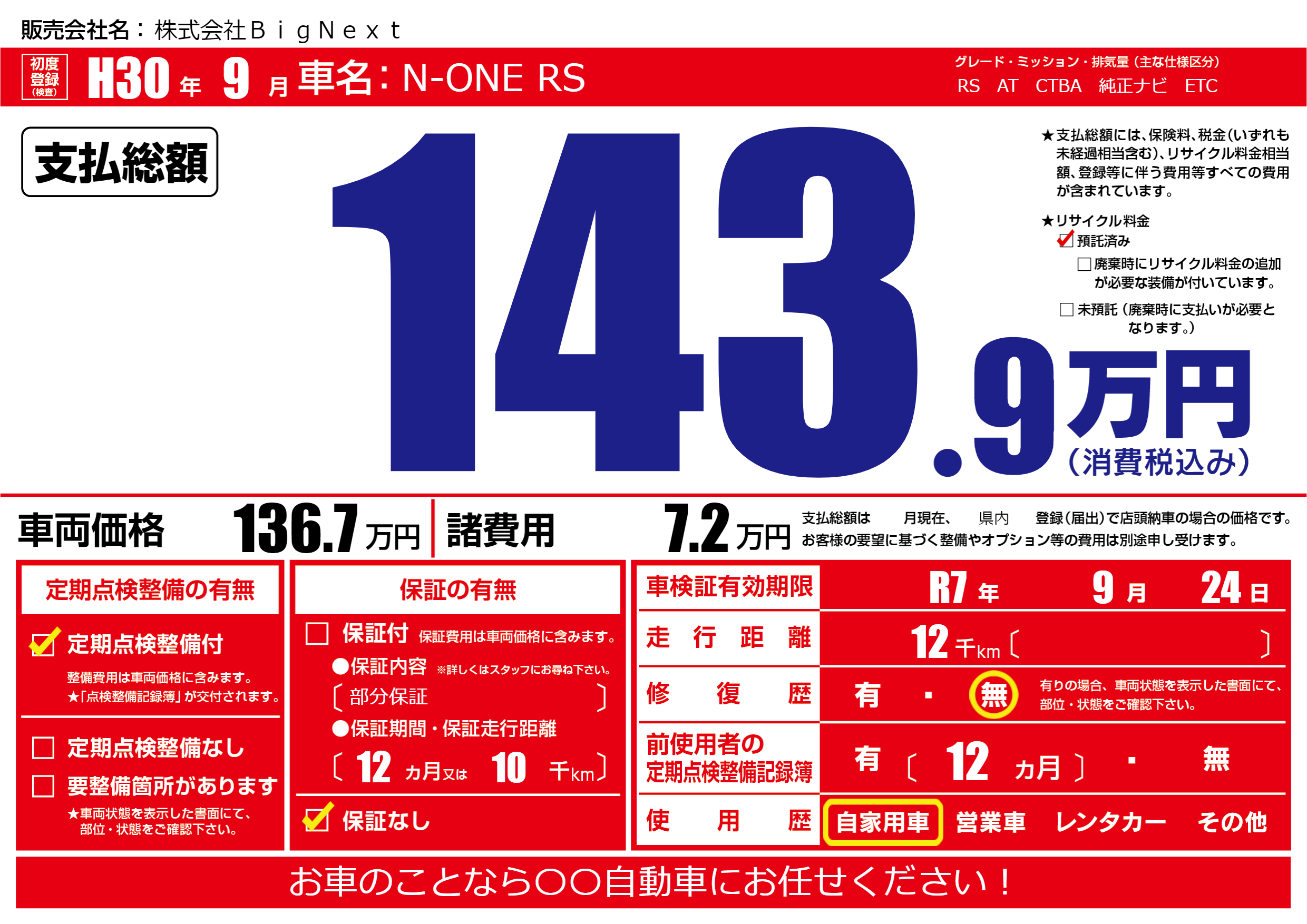 | 車名 | N-ONE RS | グレード ミッション 排気量 |
