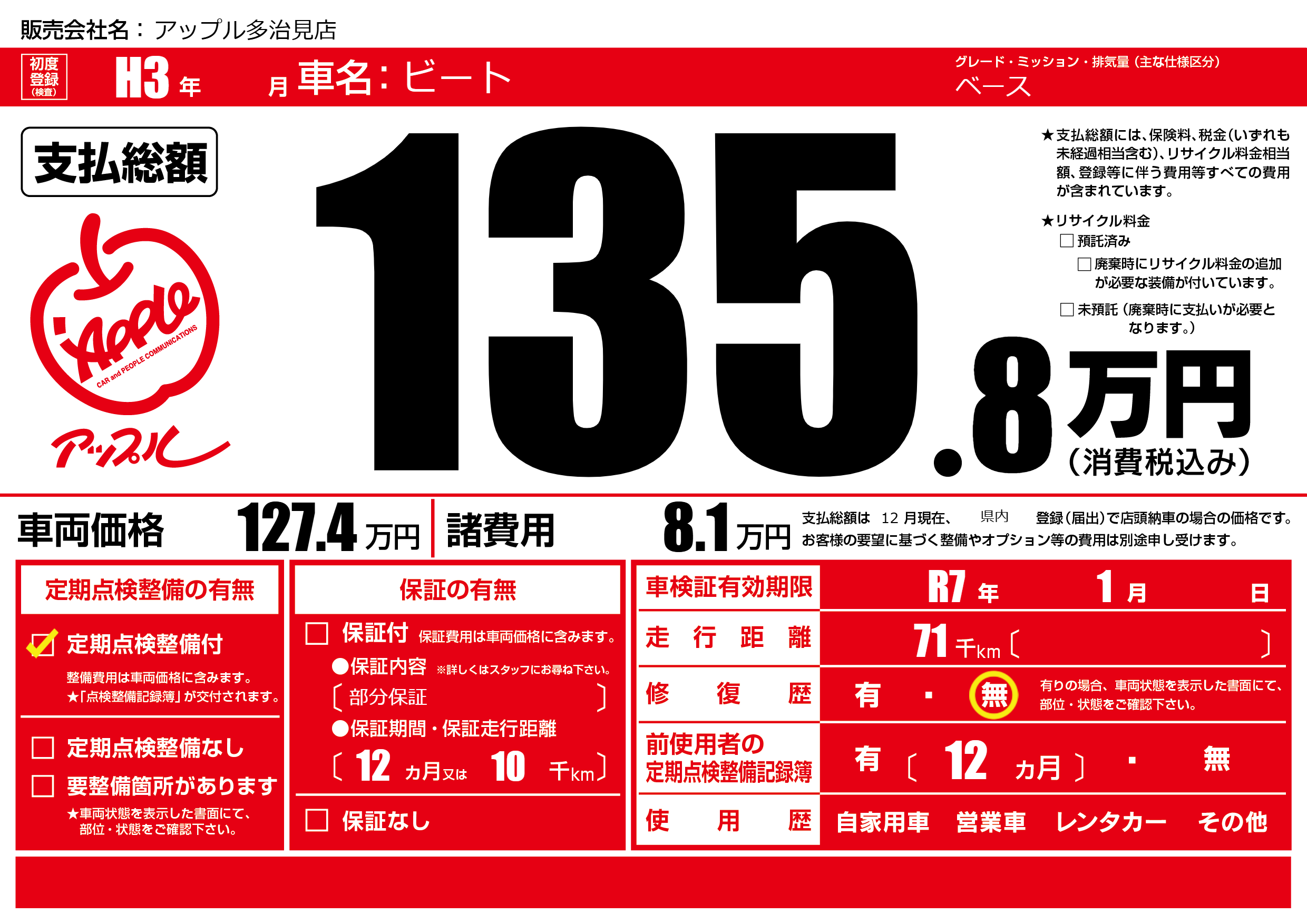 なし | リサイクル預託金相当額 | ( 0円)が別途必要 |