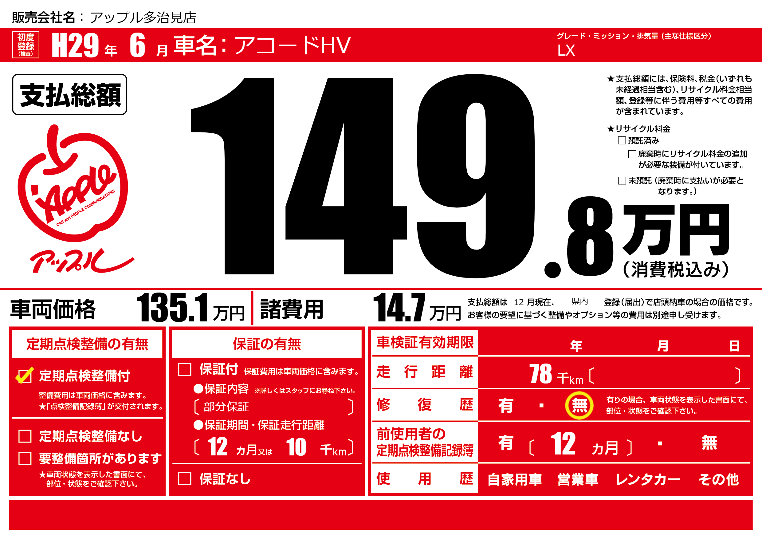| 車名 | アコードHV | グレード ミッション 排気量 |