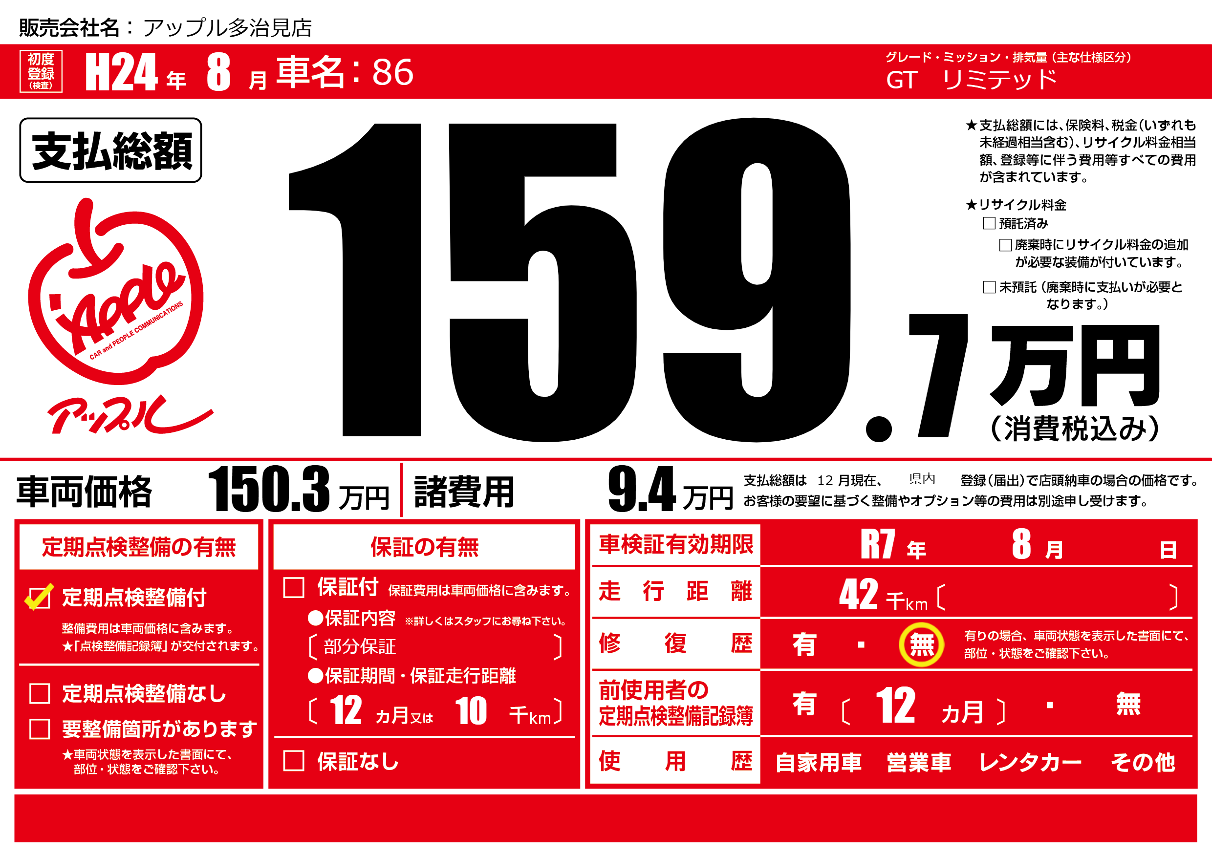 | 走行キロ | 4.2万km | 初年度登録 | H24年8月 |