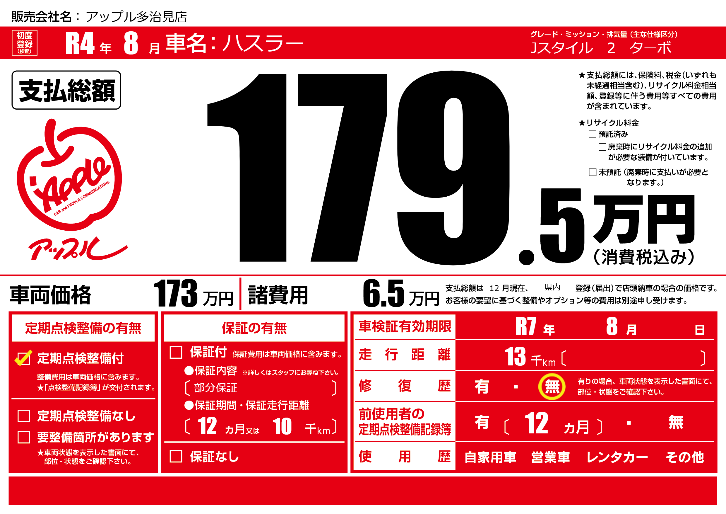 | 車名 | ハスラー | グレード ミッション 排気量 |