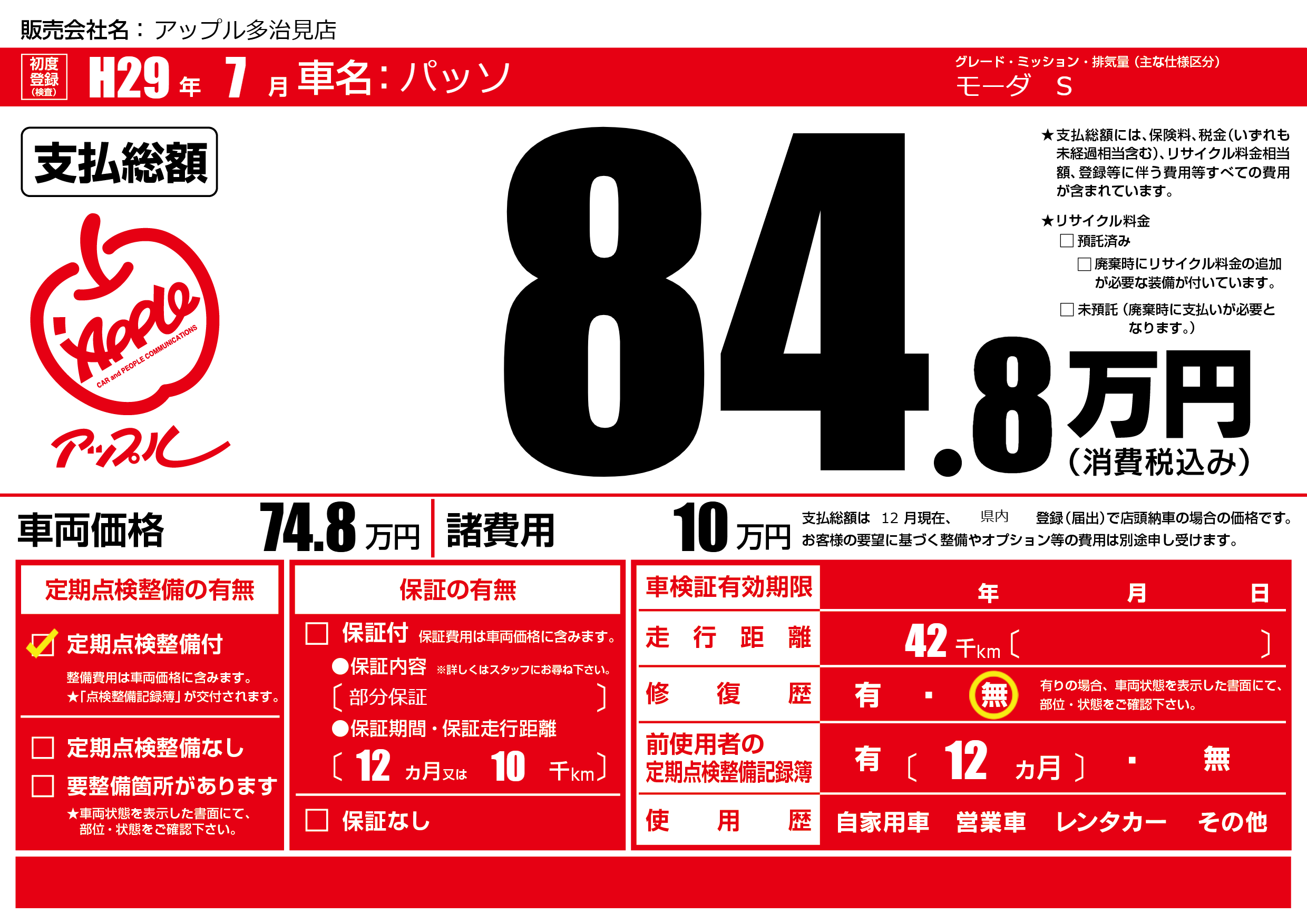| 車名 | パッソ | グレード ミッション 排気量 |