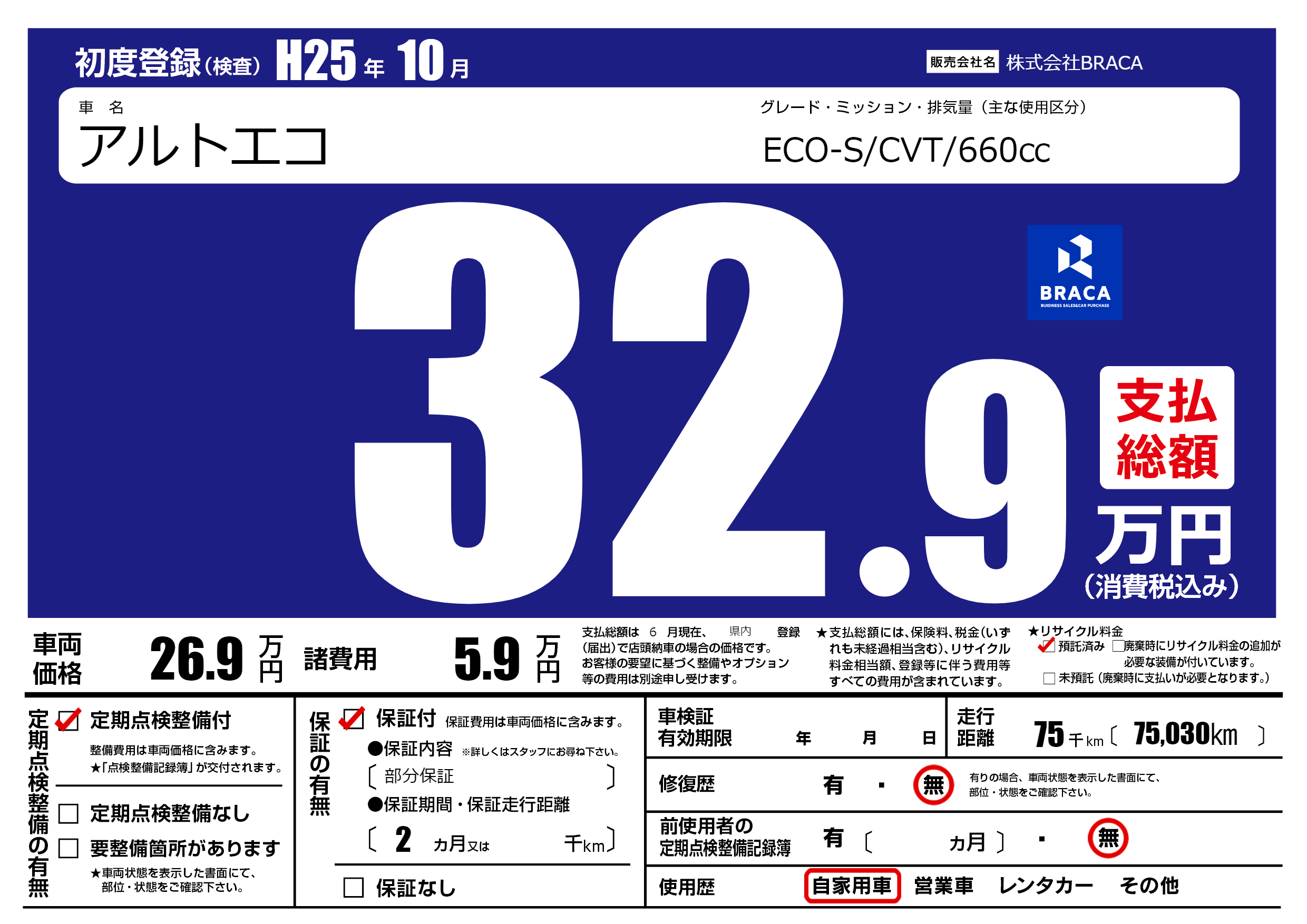 | 走行キロ | 7.5万km | 初年度登録 | H25年10月 |