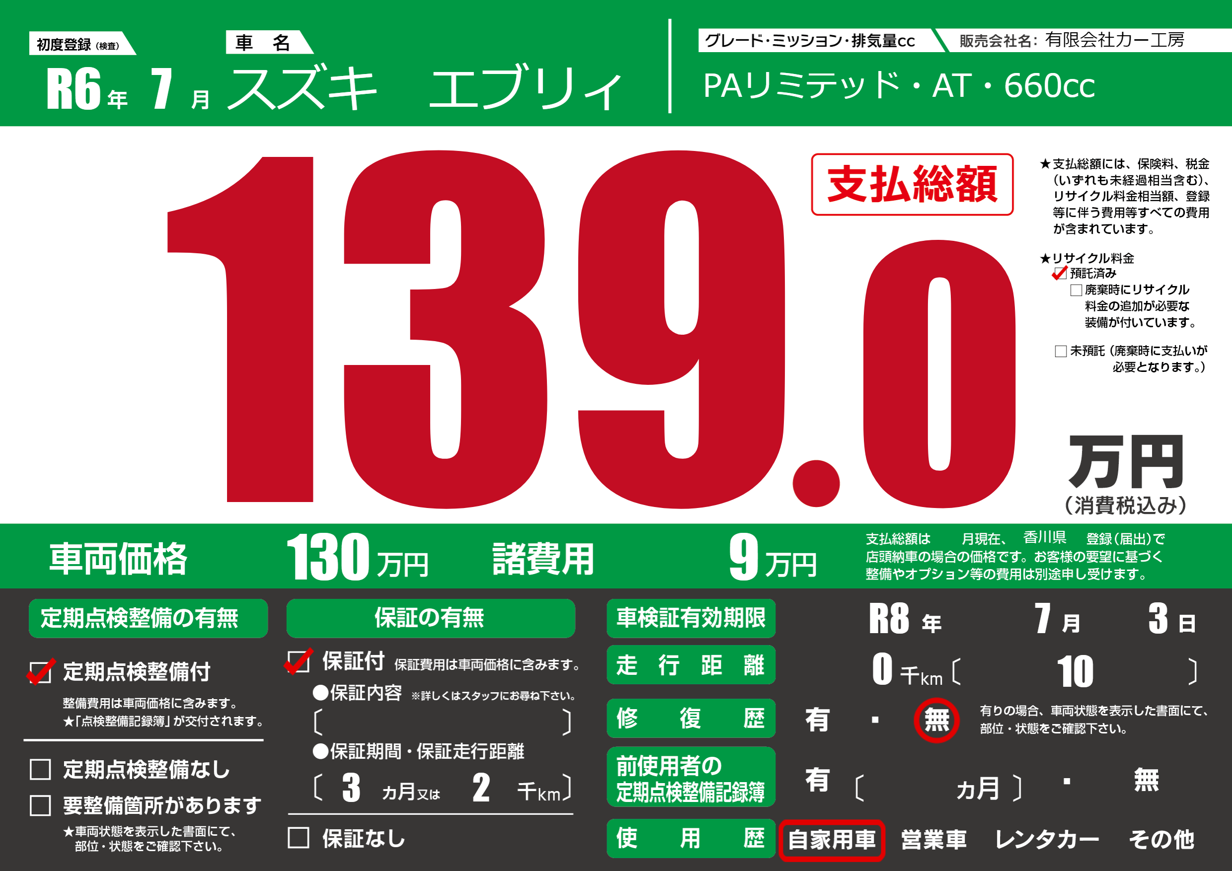 | 車名 | スズキ エブリィ | グレード ミッション 排気量 |