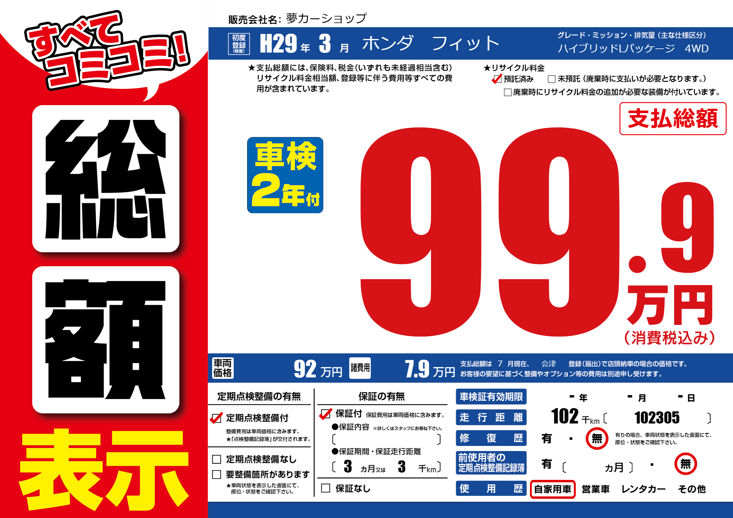 | 走行キロ | 10.2万km | 初年度登録 | H29年3月 |