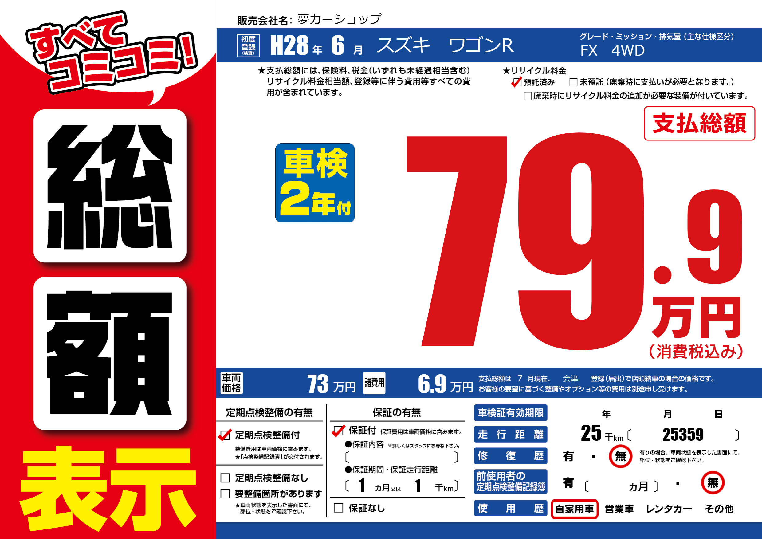 | 車名 | スズキ ワゴンR | グレード ミッション 排気量 |