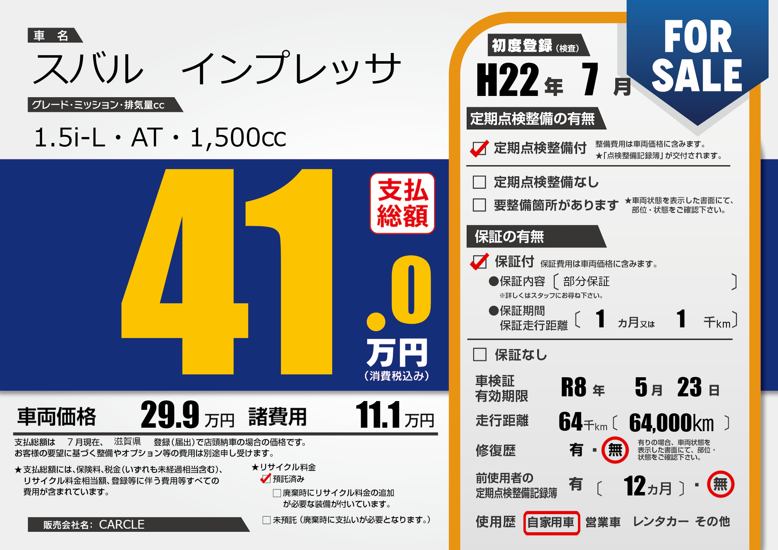 | 車名 | スバル インプレッサ | グレード ミッション 排気量 |