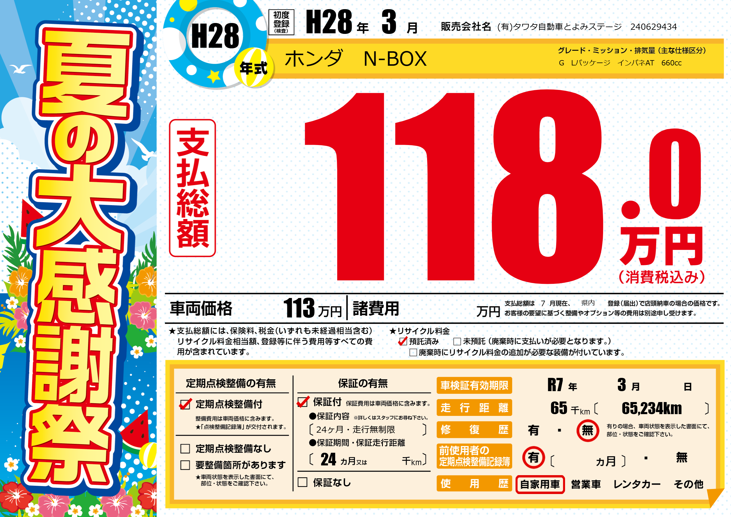 | 車名 | ホンダ N-BOX | グレード ミッション 排気量 |
