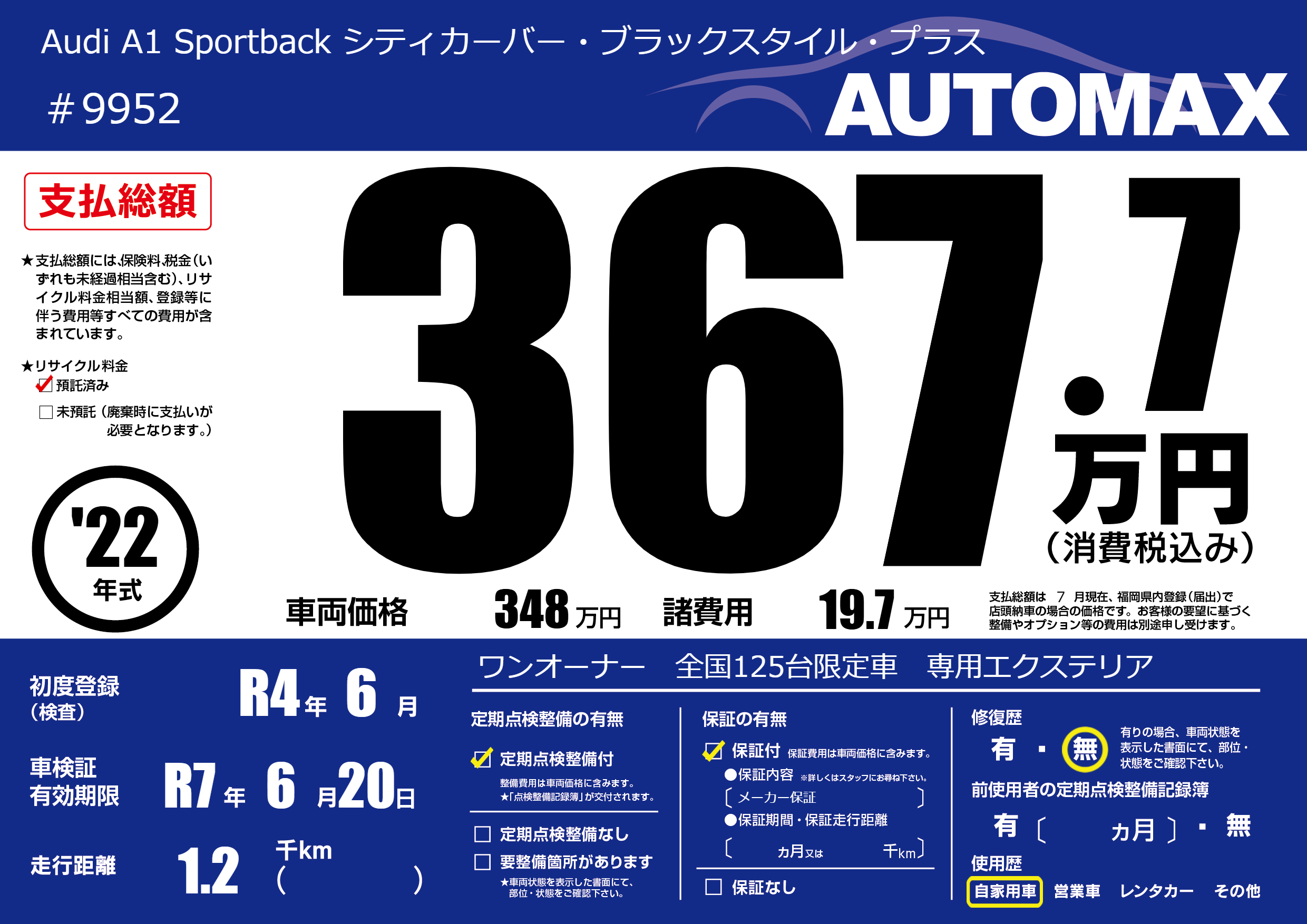 | 車名 | Audi A1 Sportback シティカーバー・ブラックスタイル・プラス | グレード ミッション 排気量 |