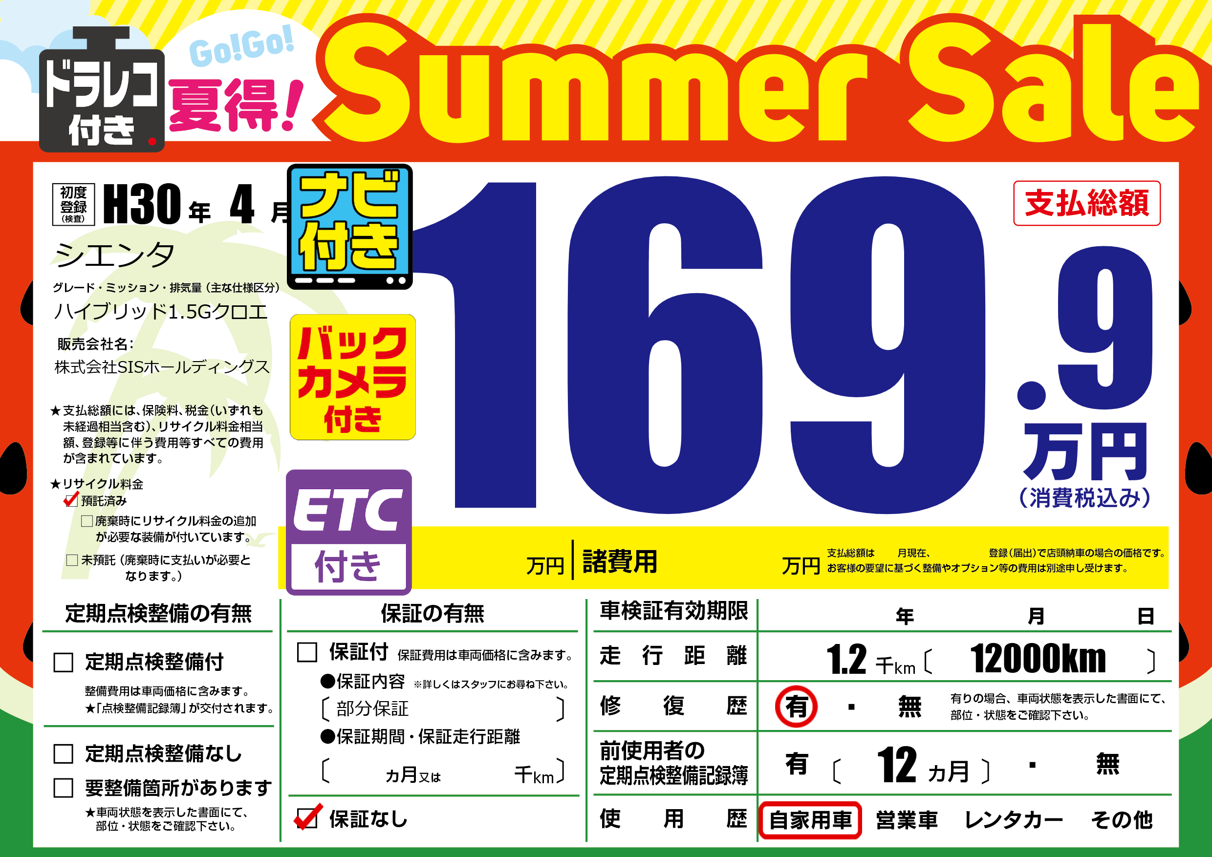 | 車名 | シエンタ | グレード ミッション 排気量 |