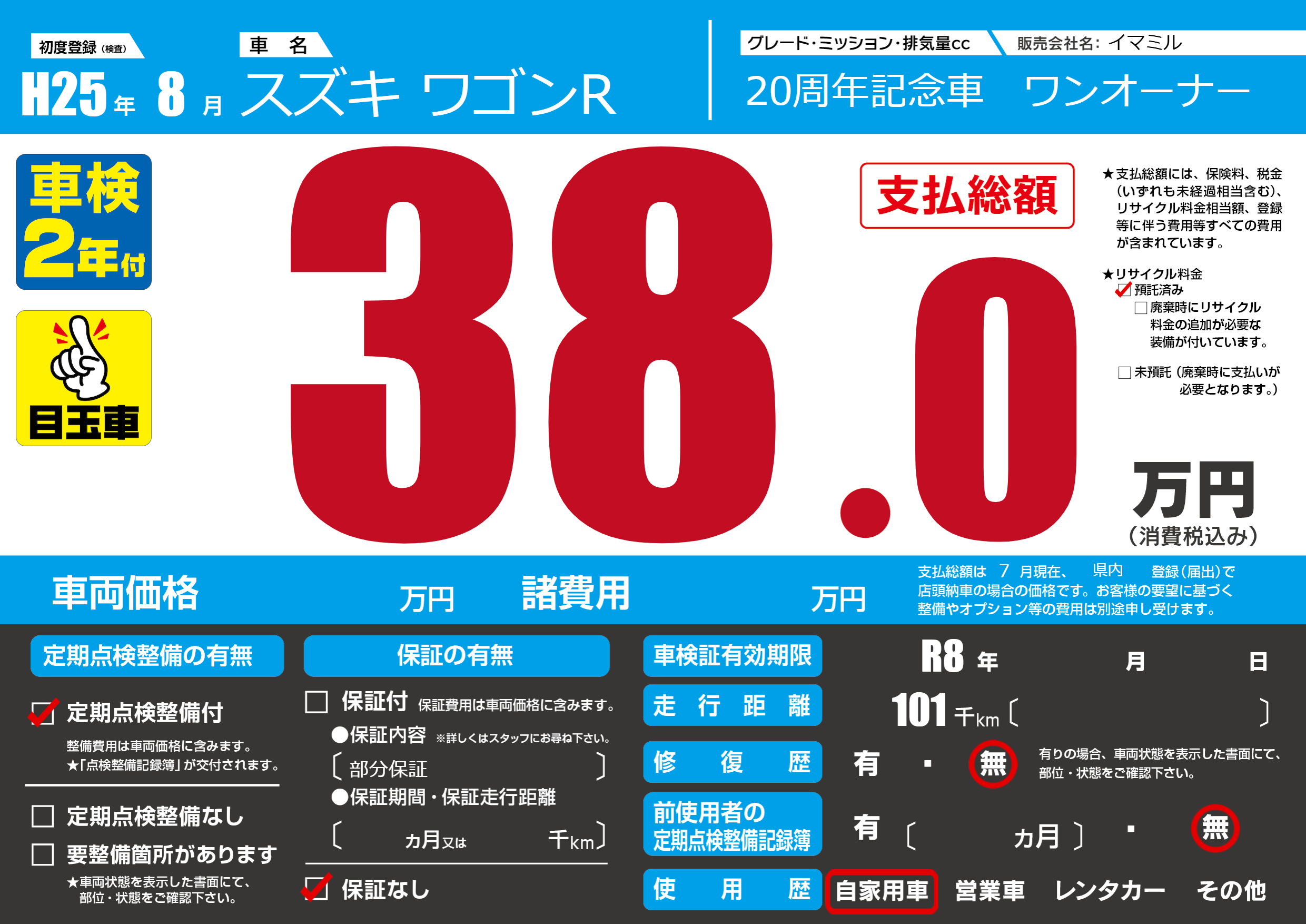| 走行キロ | 10.1万km | 初年度登録 | H25年8月 |