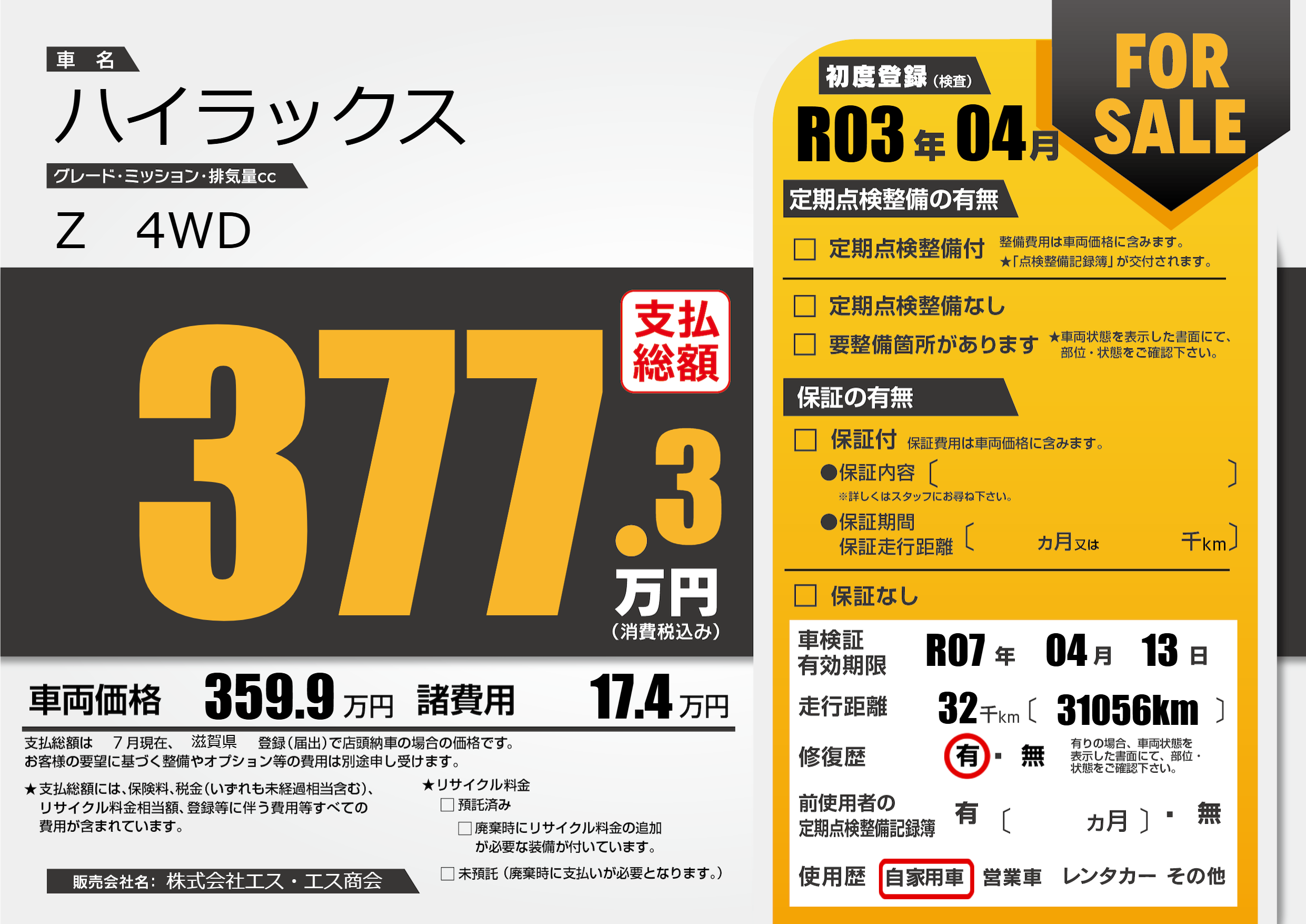 | 走行キロ | 3.2万km | 初年度登録 | R03年04月 |
