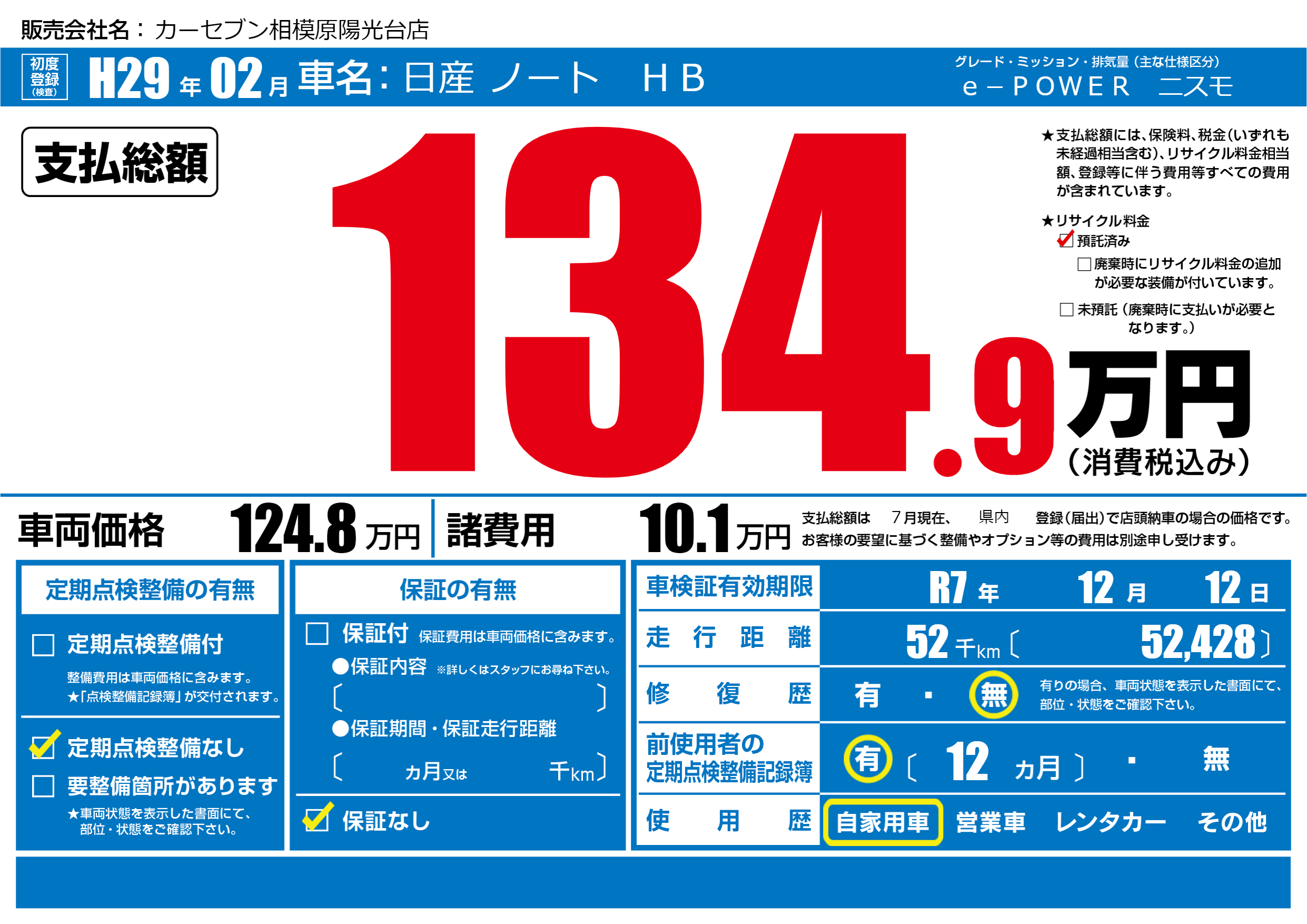 | 車名 | 日産 ノート HB | グレード ミッション 排気量 |