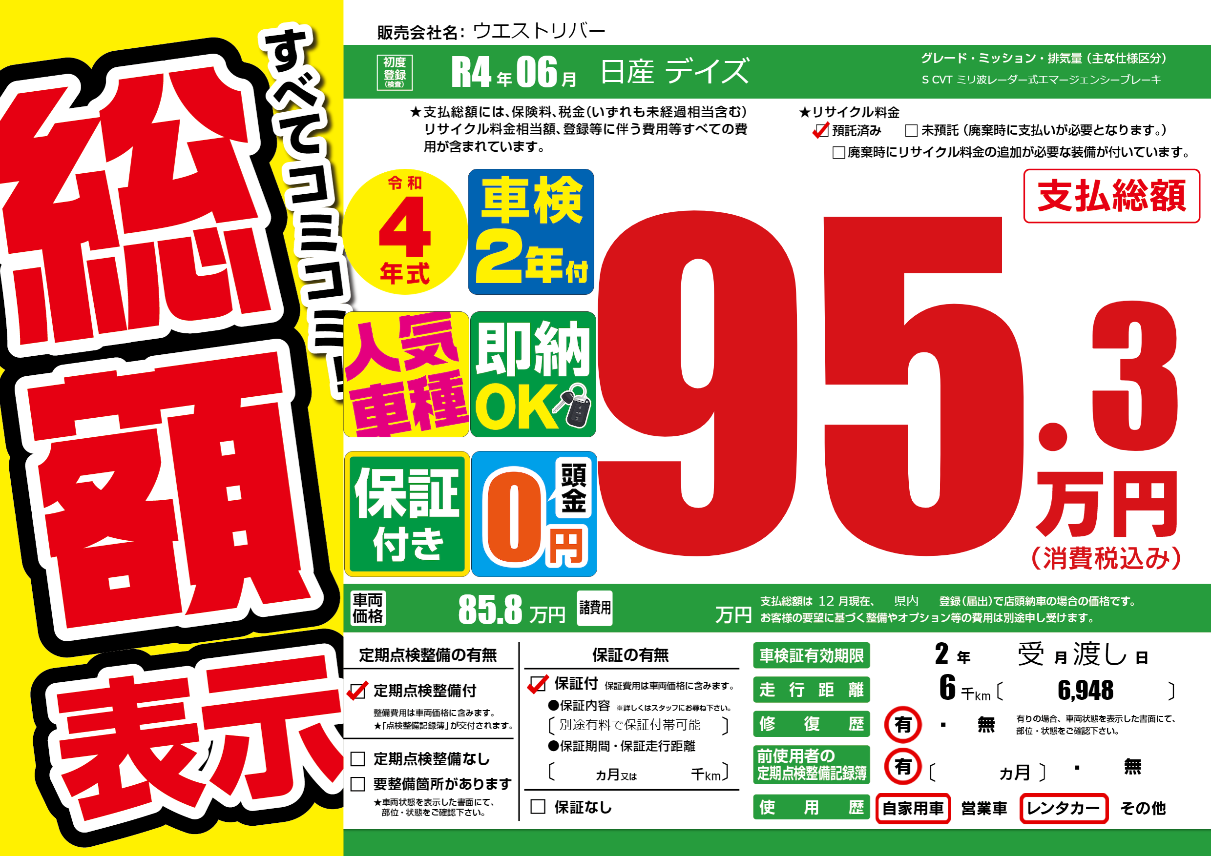 | 走行キロ | 0.6万km | 初年度登録 | R4年06月 |