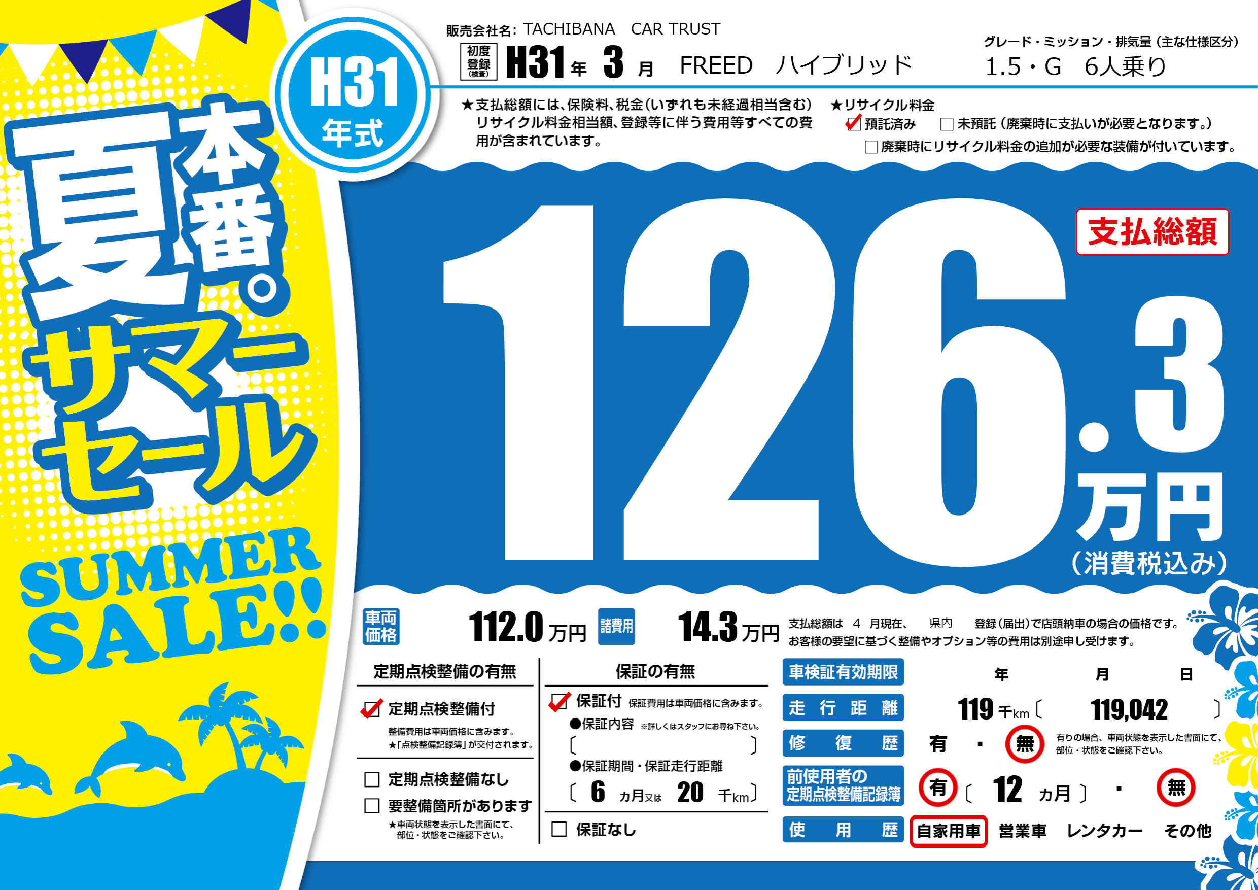 | 走行キロ | 11.9万km | 初年度登録 | H31年3月 |