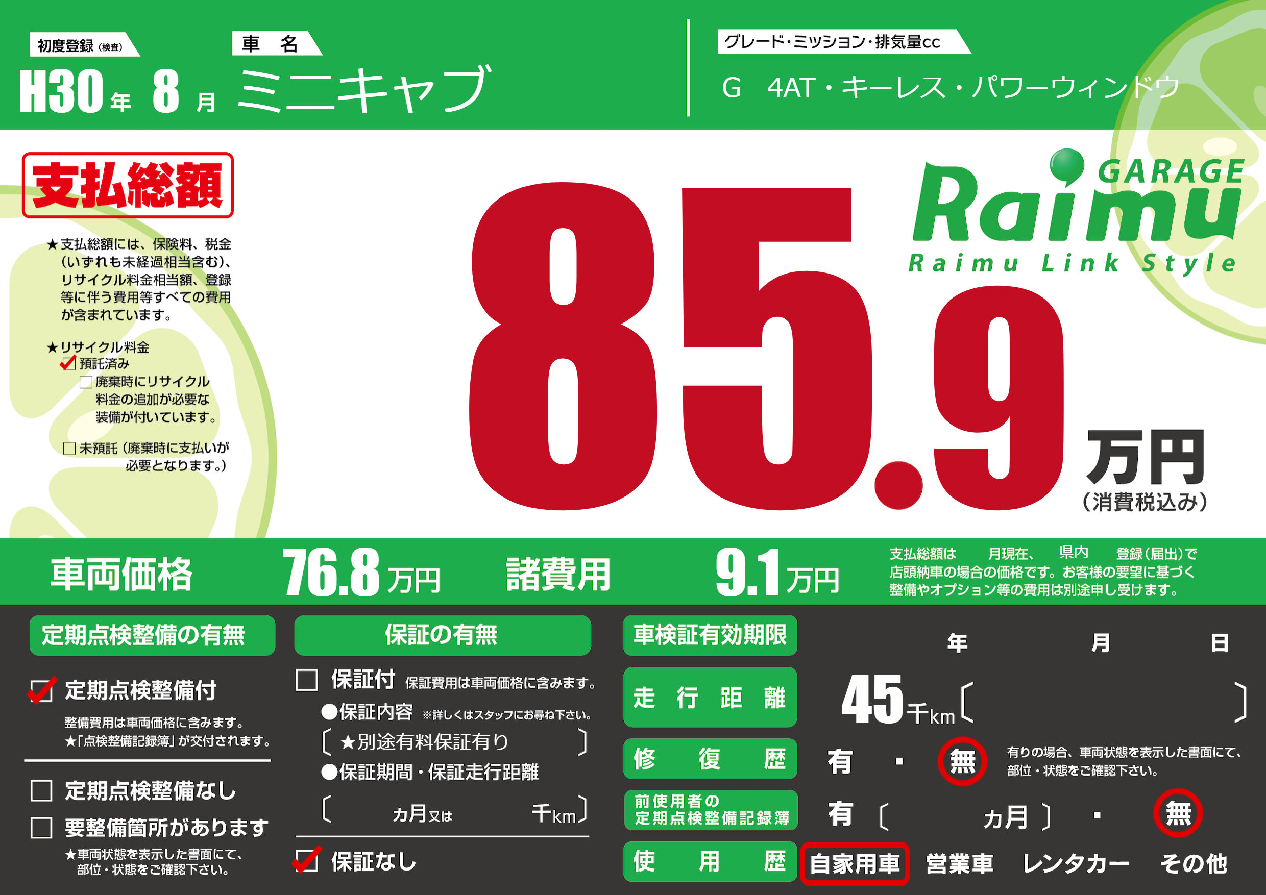保証なし 保証内容(★別途有料保証有り) ---ヶ月または()千kmまで |