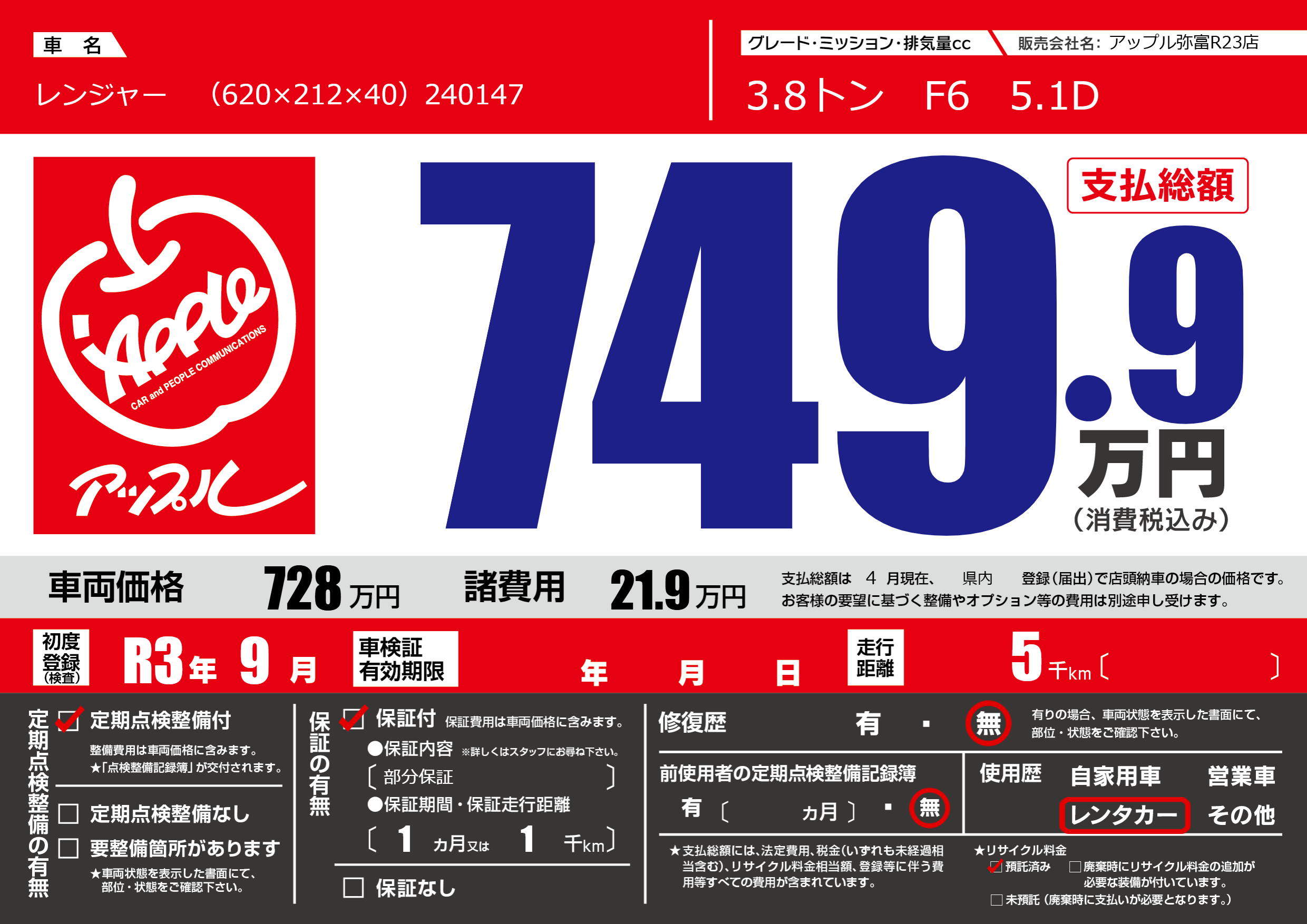 | 車名 | レンジャー (620×212×40)240147 | グレード ミッション 排気量 |