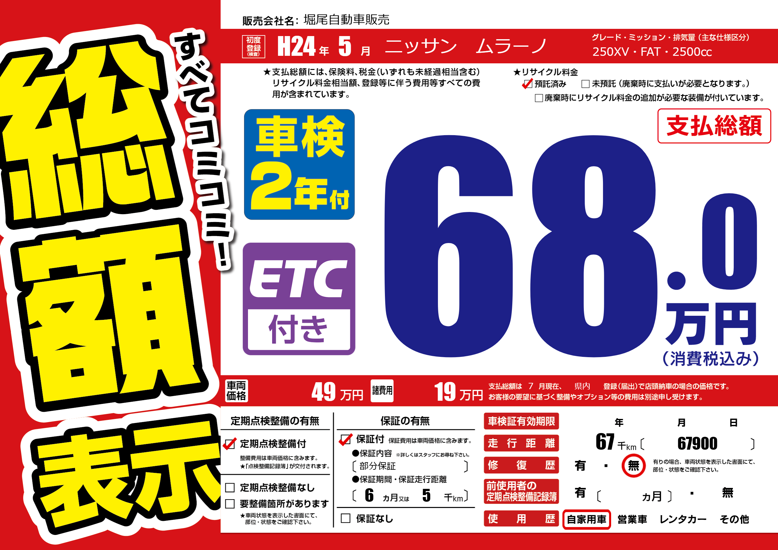 | 走行キロ | 6.7万km | 初年度登録 | H24年5月 |