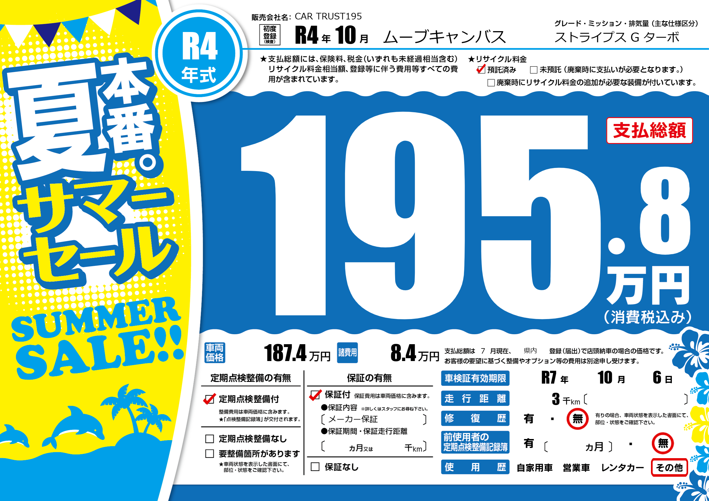 | 走行キロ | 0.3万km | 初年度登録 | R4年10月 |