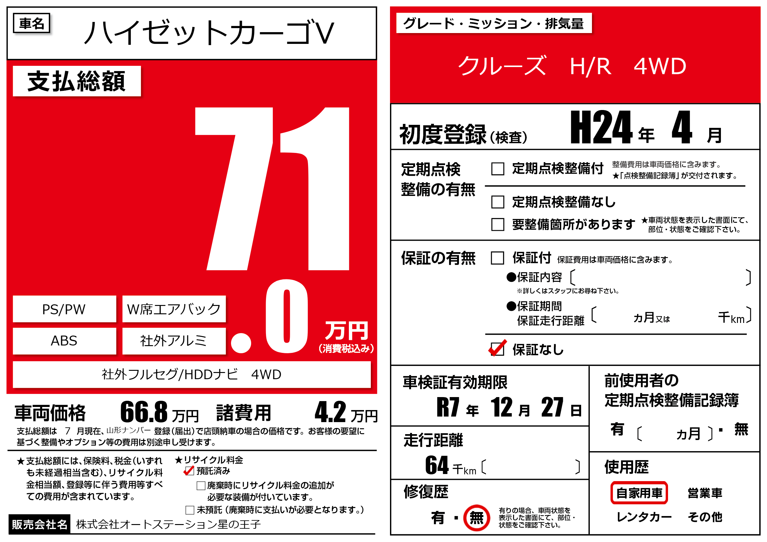 | 車名 | ハイゼットカーゴV | グレード ミッション 排気量 |