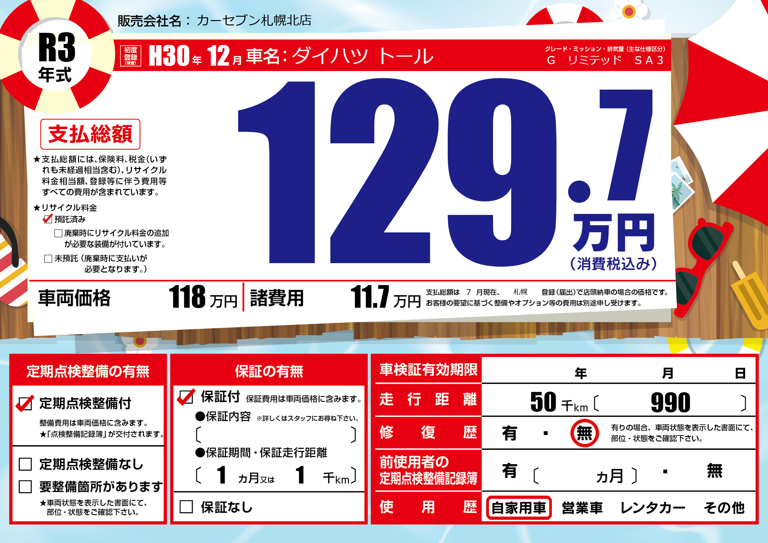 | 走行キロ | 5万km | 初年度登録 | H30年12月 |