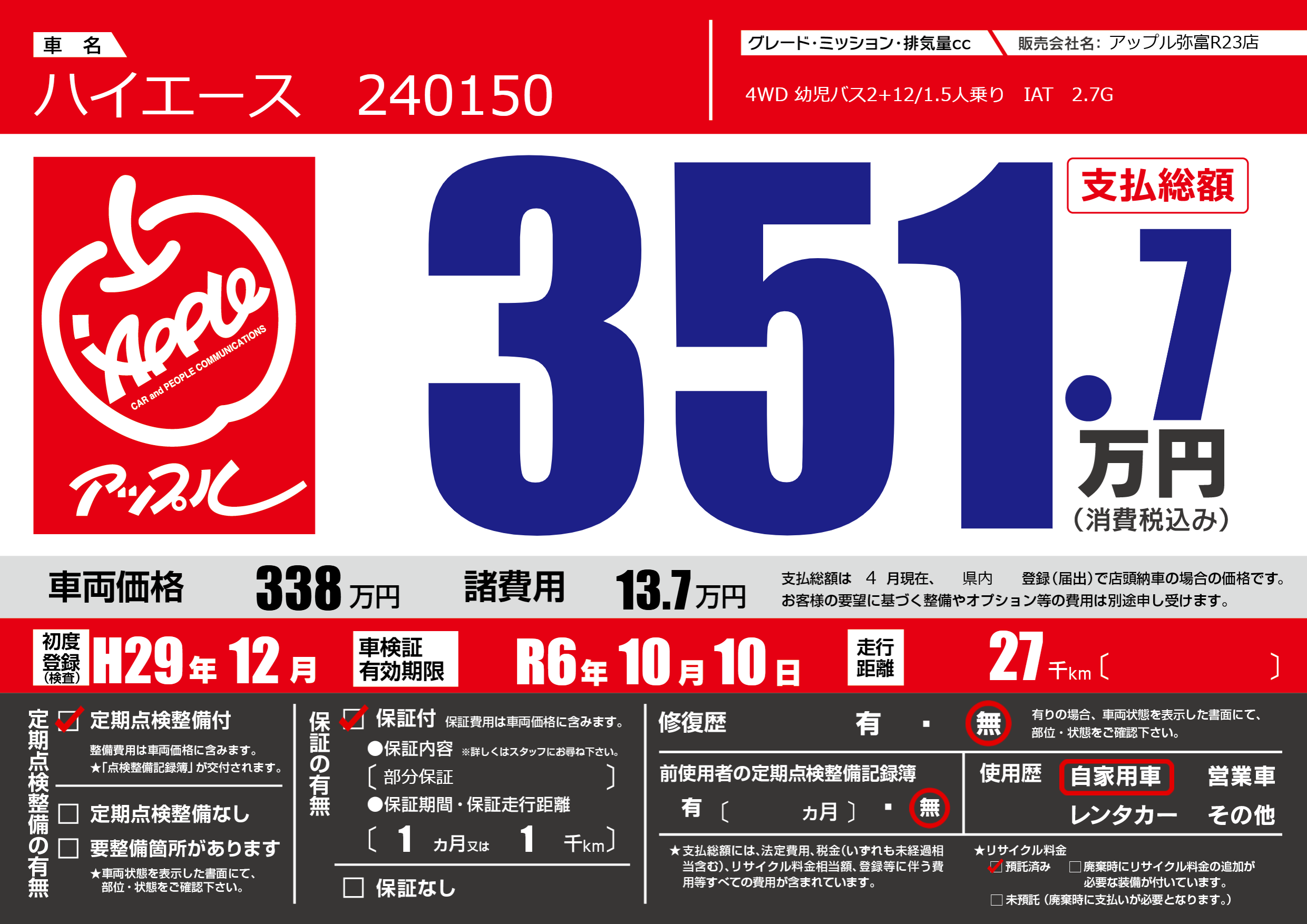 | 車名 | ハイエース 240150 | グレード ミッション 排気量 |